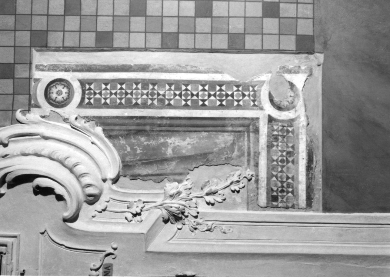 - NOTIZIE STORICO CRITICHE Lo scudo scaccato a graffito potrebbe essere quello Bartolomei (scudo a scacchi oro e rossi). Un terzo frammento riemerge dietro l'altare delle reliquie: sinopia di una figura con i calzari rossi