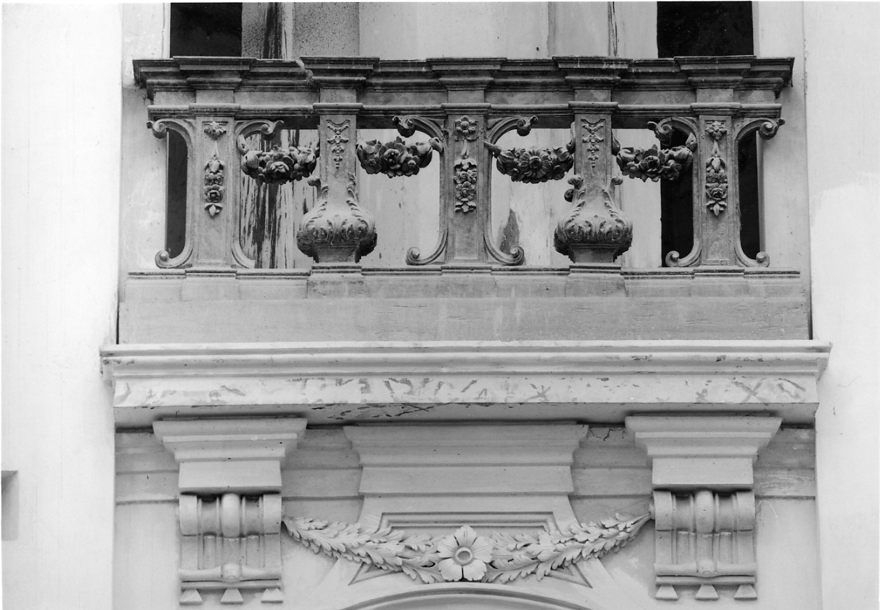 Basamento sormontato da balaustri alternati a lesene tra volute, con cimasa a fasce aggettanti. Decorazione: folgie d'acanti sui balaustri, festoni e ghirlande fiorite, volute modanate