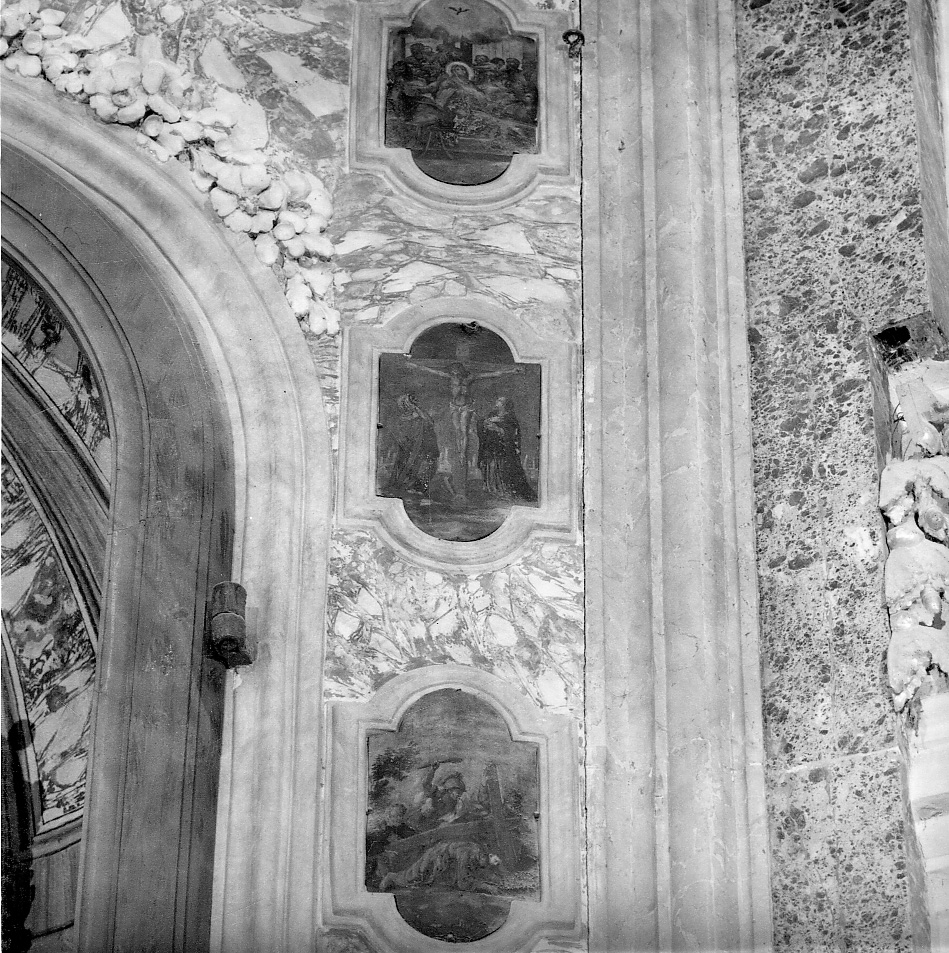 Soggetti sacri: Misteri del Rosario: Crocifissione di Cristo. Personaggi: Cristo; Madonna; San Giovanni Evangelista. Abbigliamento. Oggetti: croce. Paesaggi