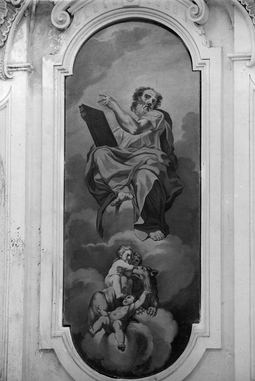 Soggetti sacri: Quattro Evangelisti. Personaggi: San Marco. Attributi: (San Marco) bue; libro. Figure: angeli. Abbigliamento. Fenomeni metereologici: nuvole
