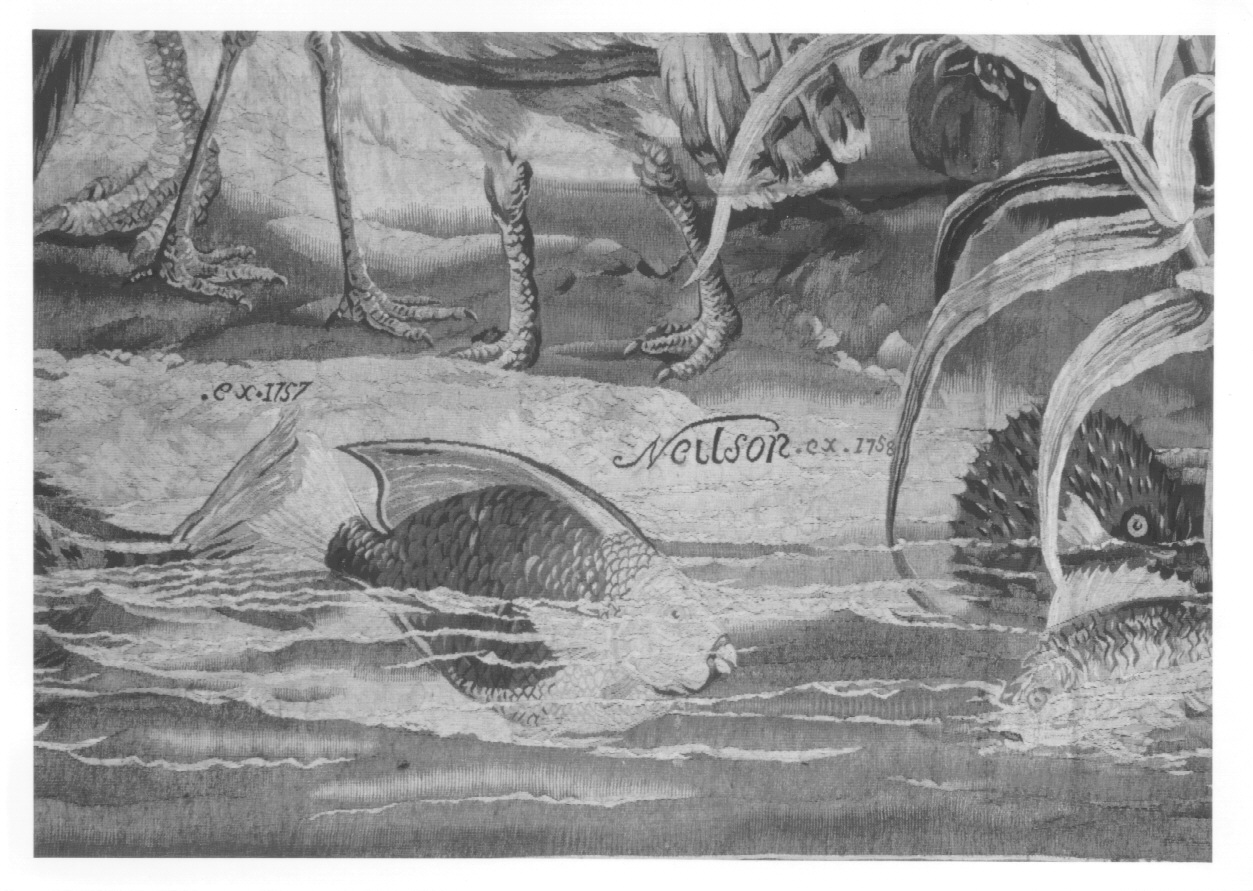 Riduzione ordito 8 cm.; riduzione trame 13 cm. Frammento centrale. Crapantage contrastè; cotes alternées, battage. Bordura uso cornice con un fregio con conchiglia a metà di ogni lato e fregi con gigli di francia ai quattro angoli. Nella scena centrale un cacciatore scuro di pelle, seminudo e con un arco in mano, siede di spalle sotto un albero di limoni (?) e un cactus popolati di uccelli e pappagalli colorati. Sulla destra animali di terra di varie specie intorno ad una palma; ancora più a detsra rettili vari, granchi e tartaruga arrampicati su di una montagnola. Ai piedi del cacciatore paesaggio acquatico (mare?) popolato di grandi pesci. Colori predonimanti: verde in più tonalità, azzurro, rosso , marrone, ocra, beige chiaro e luminoso del fondale. Cimosa azzurra. Fodera intera, non originale in 6 teli; lungo il lato basso altra fascia di rinforzo. Sospensione: anelli cuciti sulla fodera lungo il lato alto e parte dei lati laterali (rimossi nel 1988)