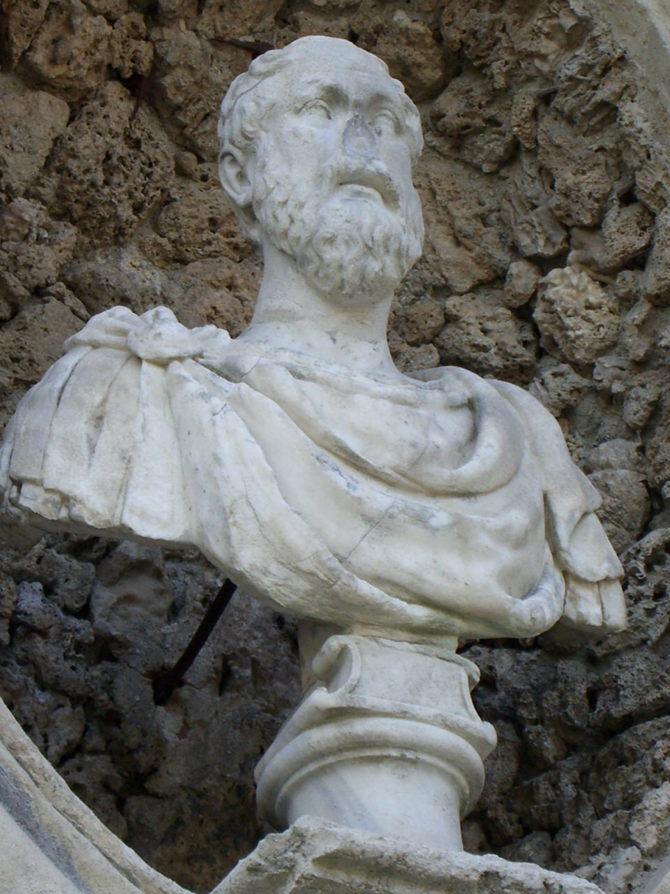 Busto maschile con barba e ampia toga avvolta sul petto; è collocato su due piedistalli sovrapposti (il primo circolare, il secondo di prospetto mistilineo)
