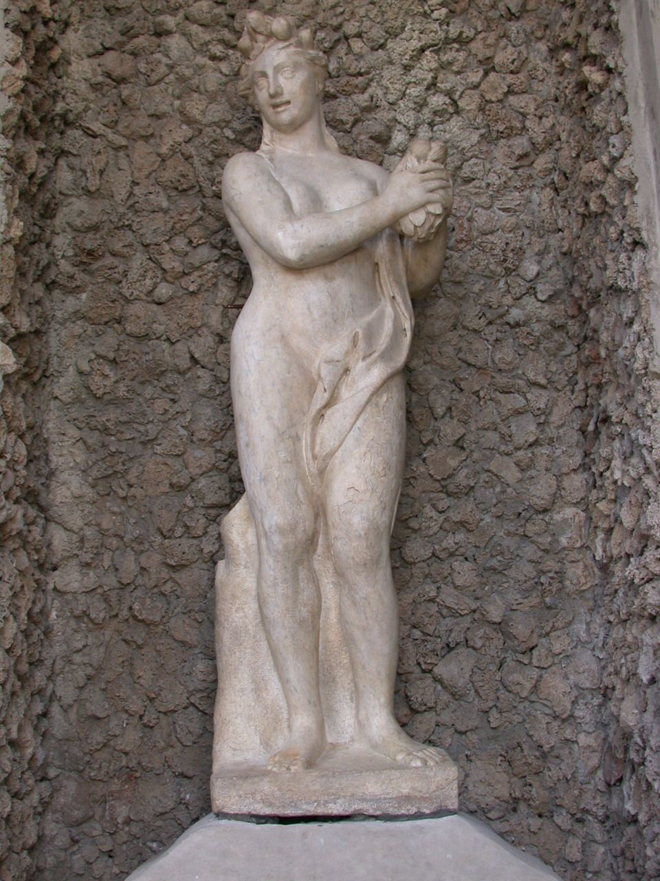 Statua di figura femminile appoggiata ad un tronco. Il braccio destro è sollevato a reggere sul fianco sinistro un pesce