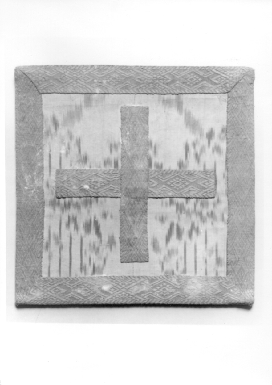 Borsa di corporale, parte di paramento liturgico composto anche da un manipolo (cm 23x112). Tessuto: il motivo decorativo è definito da piccole macchie di colore prodotte dalla tecnica caratteristica detta "Chiné à la Branche". Fondo avorio, motivo policromo. Galloni: al telaio e nella croce centrale (cm. 3.5) in seta gialla con motivi stilizzati a rombi. Fodera tela in canapa cerata