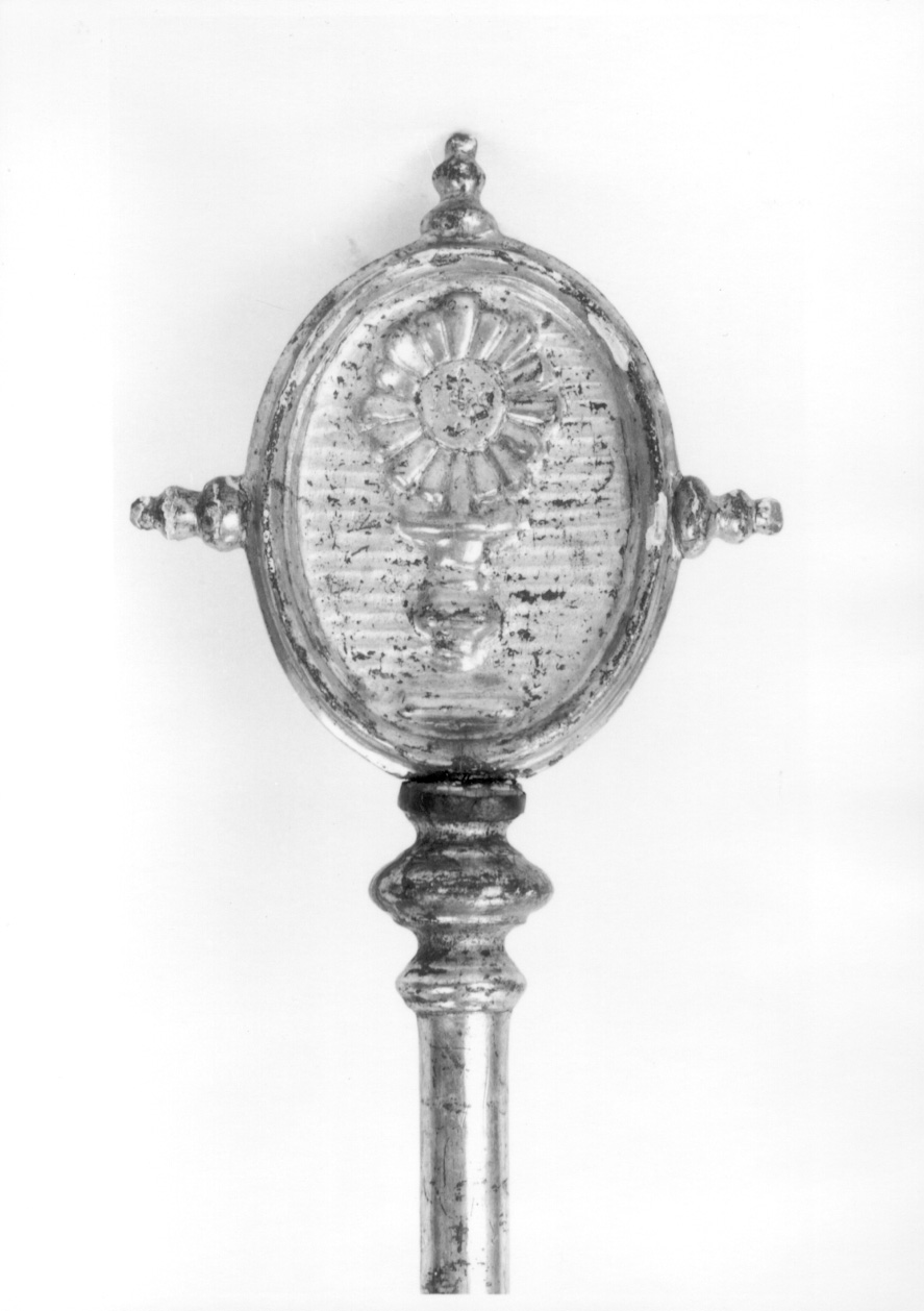 l'insegna è composta da una mostra di forma ovale con tre raggi torniti sui lati liberi, con al centro l'emblema dell'ostensorio raggiato, unito, con un nodo tornito, a un fusto argentato