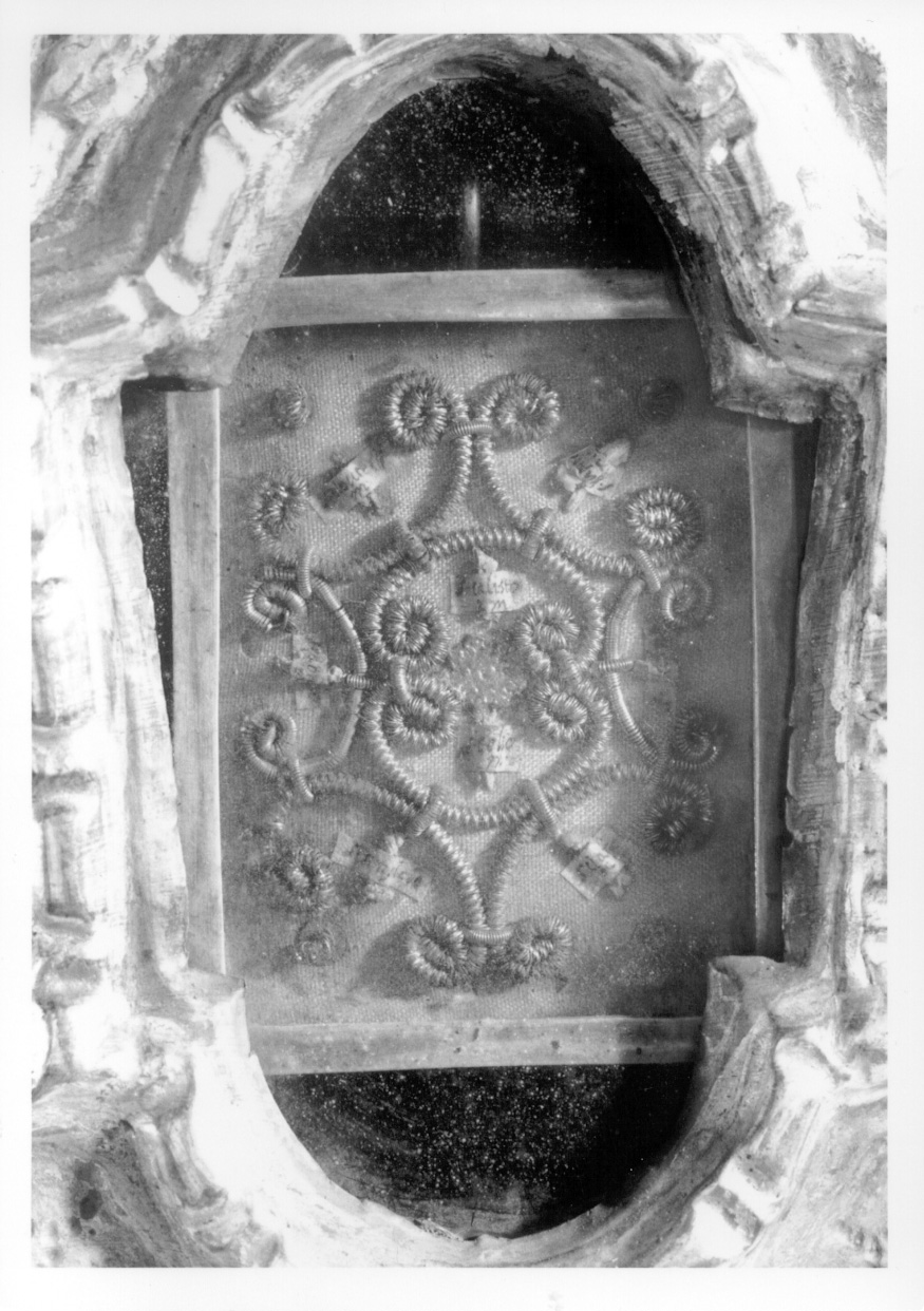 - NOTIZIE STORICO CRITICHE Sui reliquiari non sono stati rinvenuti punzoni, anche se la lamina sembra essere d'argento. Stilisticamente sono databili tra la fine del Settecento e l'inizio dell'Ottocento. L'altro esemplare riporta la stessa etichetta del 1933 con l'indicazione del numero 12. Nell'inventario del 1955 i due reliquiari in pendant hanno il numero 7521/ 11 e 7521/12: quindi hanno in parte mantenuto la numerazione del 1933, che evidentemente era relativa ai reliquiari (esiste infatti un'altra opera con etichetta ovale del 1933 riportante il numero 11, il dipinto sindonico OA SBAS TO 00088312). Nel 1955 i reliquiari si trovavano nell'armadio per sacrestia, sportello n.1 - piano II. In occasione della verifica inventariale a seguito della vendita allo Stato (1982) fu notata la perdita dei nastri e la manomissione dei sigilli sul retro. Nella teca sono conservate le reliquie di diversi santi: sant'Eleuterio, sant'Agapito, san Placido, santa Clarina, santa Simplicia, san Dionigi martire, san Callisto papa e san Celso martire; nella teca dell'esemplare in serie sono reliquie di sant'Agapito martire