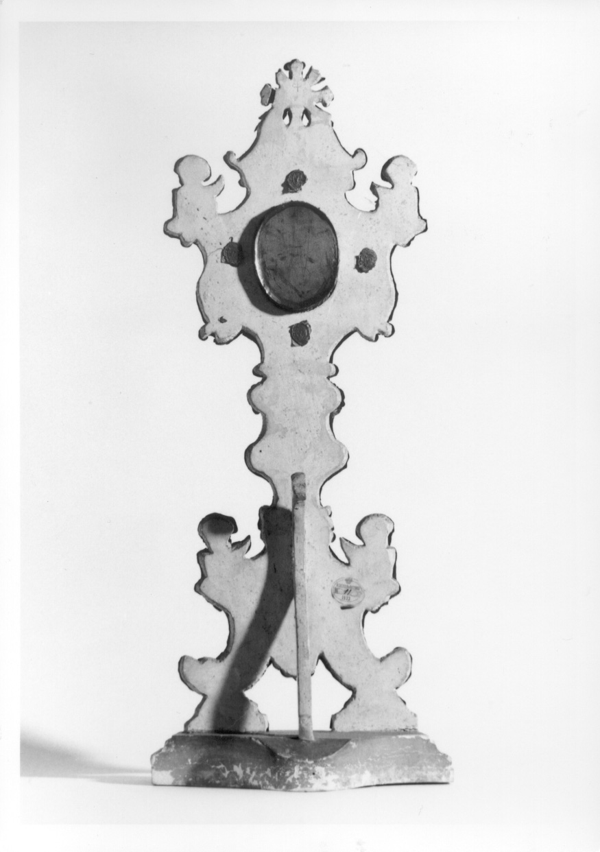 Struttura lignea su cui è applicata lamina d'argento sbalzata e cesellata. Basamento ligneo modanato su cui poggiano elementi triangolari che sostengono piedi a volute con ricciolo verso l'esterno, uniti al centro da conchiglia. Base a sezione quadrangolare con scudo centrale, sormontata da due cherubini posti specularmente. Fusto mistilineo che sostiene parte superiore con teca per le reliquie. Crocetta apicale e cherubini ai lati. I diversi settori sono decorati da volute che ne seguono l'andamento, con motivi fitomorfi a lato della teca e sfondo cesellato. Sul retro piede ligneo
