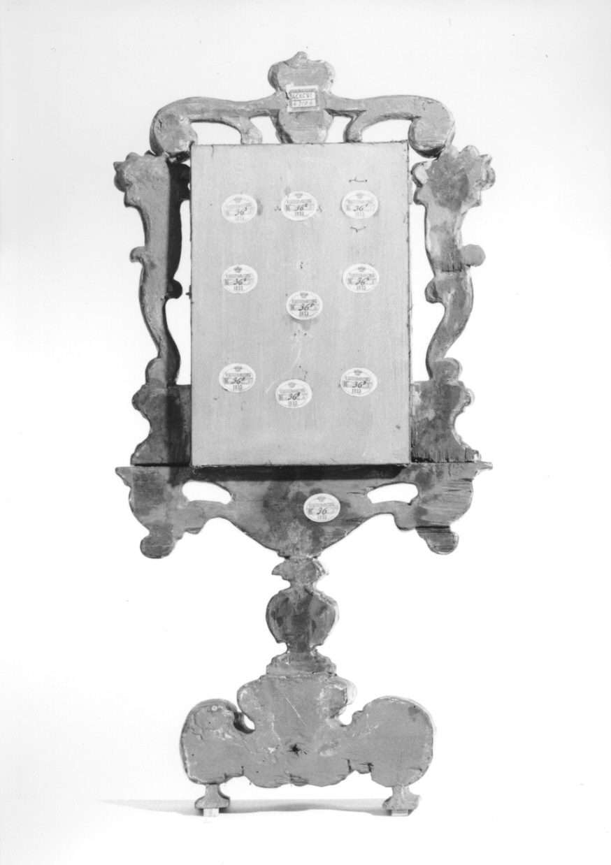 Reliquiario con vetrina rettangolare contenente nove medaglioni con reliquie, fissati a pannello rivestito in tessuto. Base mistilinea con volute alle estremità e piedini rettangolari; fusto fogliato con conchiglia che sostiene la parte superioer, con vetrina, incorniciata da cornucopie laterali e volute nei lati inferiore e superiore, con conchiglia al centro