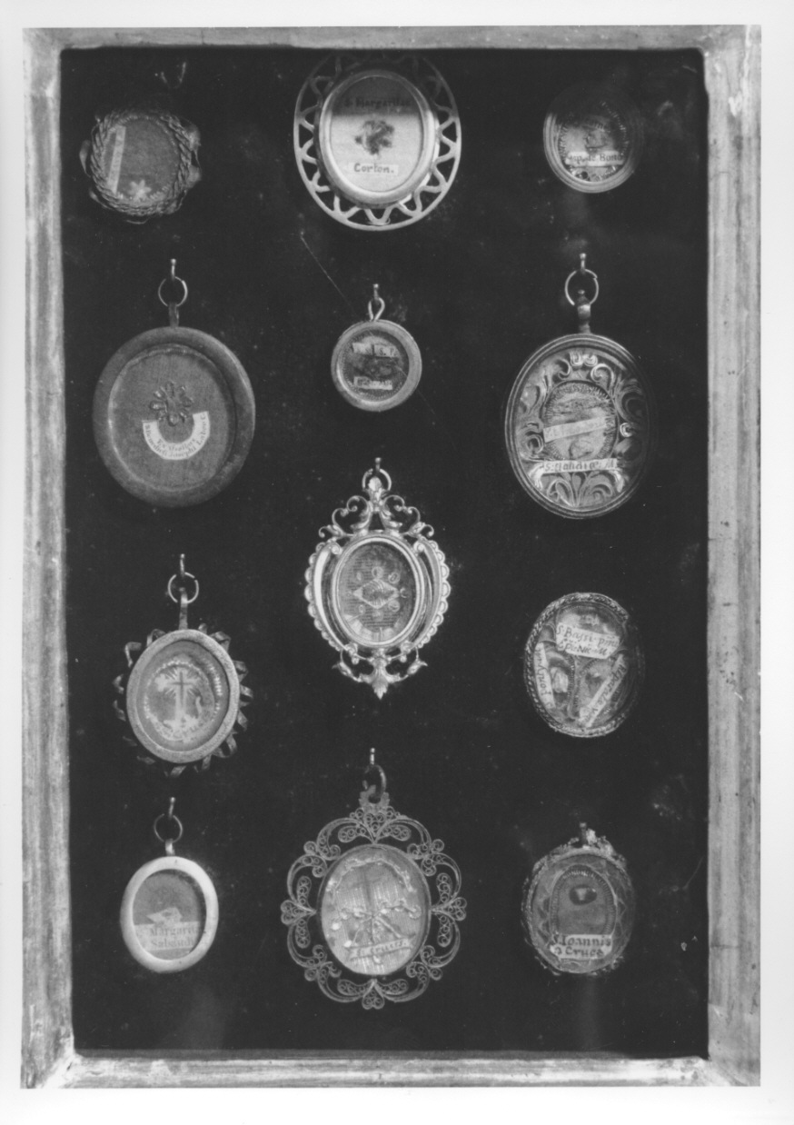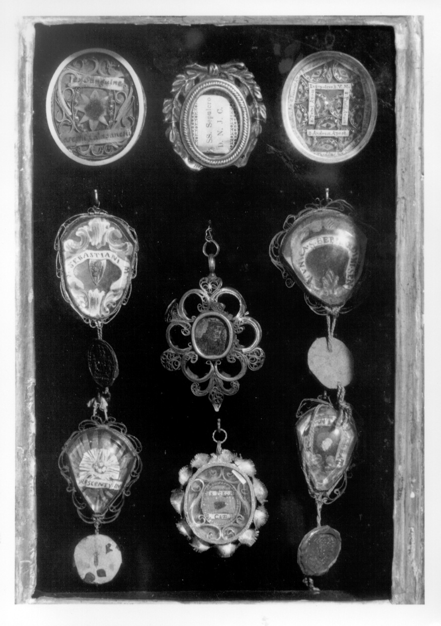 - NOTIZIE STORICO CRITICHE Nell'inventario del 1955 il reliquiario è identificabile con il numero R 7521/36, e allora si trovava nell'armadio per sacrestia, sportello n.1 - piano II. Sul pannello ligneo sul retro della vetrina sono posti tanti bollini ovali dell'inventariazione del 1933 quanti sono i medaglioni con reliquie contenuti all'interno, riportanti il numero d'inventario con un esponente. Non è chiaro a quale inventario si riferisca l'etichetta rettangolare con numeri romani. L'esemplare in serie, che dovrebbe avere il numero di inventario del 1933 N. 35, corrispondente al numero R 7521/35 del 1955, contiene 12 medaglioni con reliquie. I medaglioni sono quasi tutti differenti tra loro per forma e dimensioni, con decorazioni in filigrana o con cornici lavorate a traforo o lisce, con o senza sigilli, ed alcuni contengono anche reliquie di diversi santi