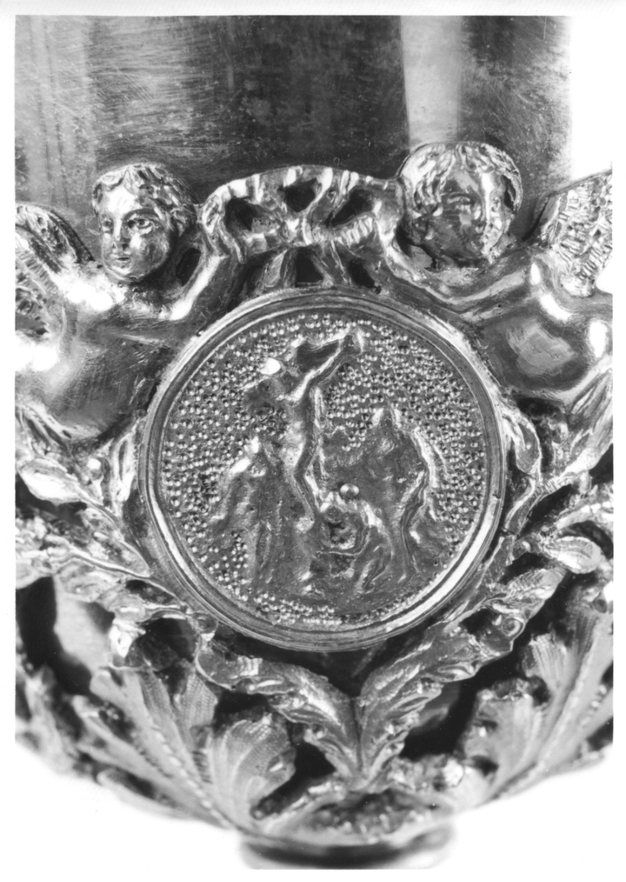 Medaglione entro cui è raffigurata la scena della Crocifissione con Cristo crocifisso e, ai piedi della croce, la Vergine, san Giovanni Battista e santa Maria Maddalena