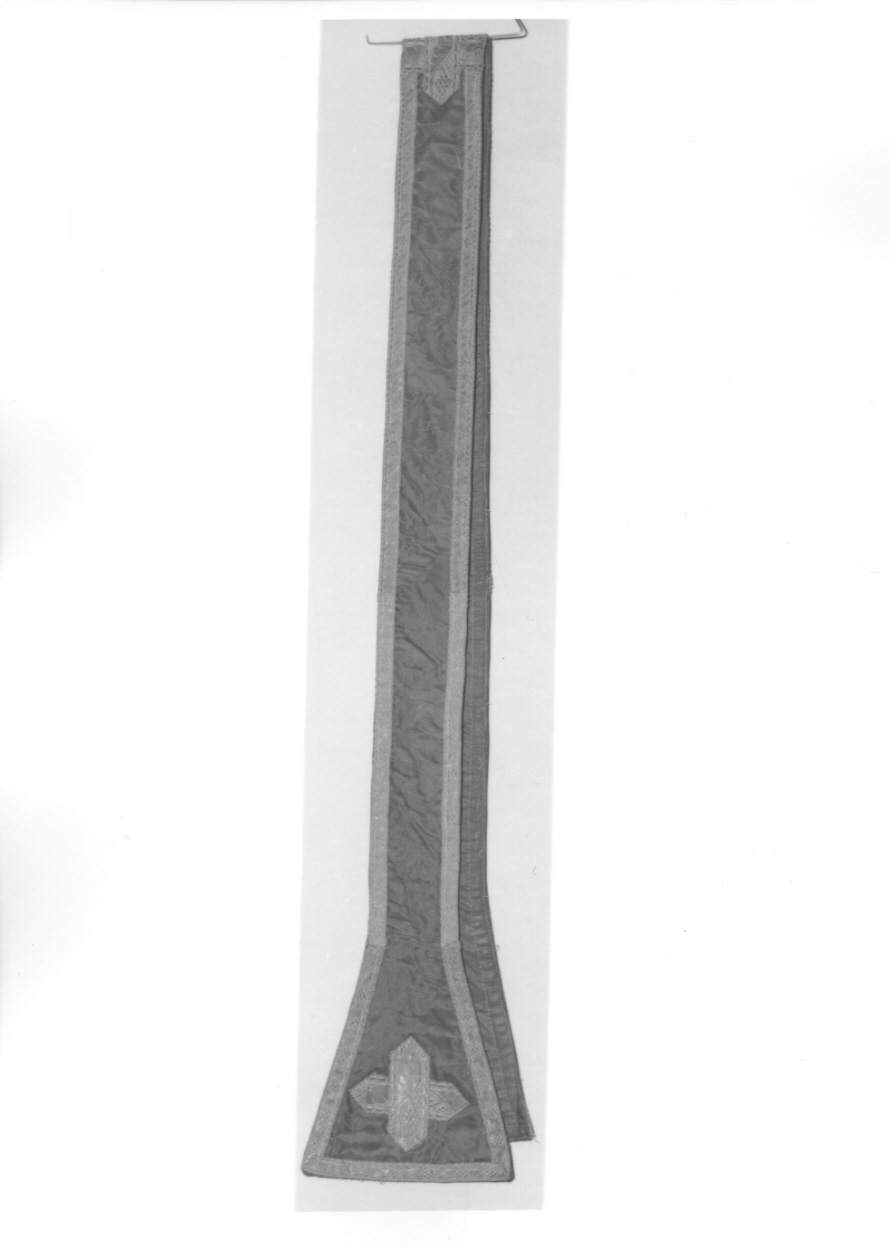 La stola è confezionata in damasco di seta verde (fondo faccia ordito, disegno faccia trama); è guarnita di galloni diversi: due in filo d'argento e cotone a telaio, due in filo dorato e cotone a telaio, uno in filo dorato e seta a telaio; fodera in tela di cotone verde oliva
