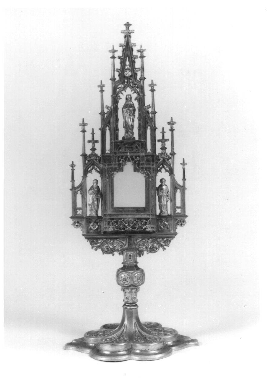 Piede: a sagomature mistilinee. Nodo: esagonale a sfera schiacciata con elementi circolari. Teca con cornice a tempietto gotico con pinnacoli, guglie e statuette. Crocetta apicale. Decorazioni: a girali, fogliami e fiori