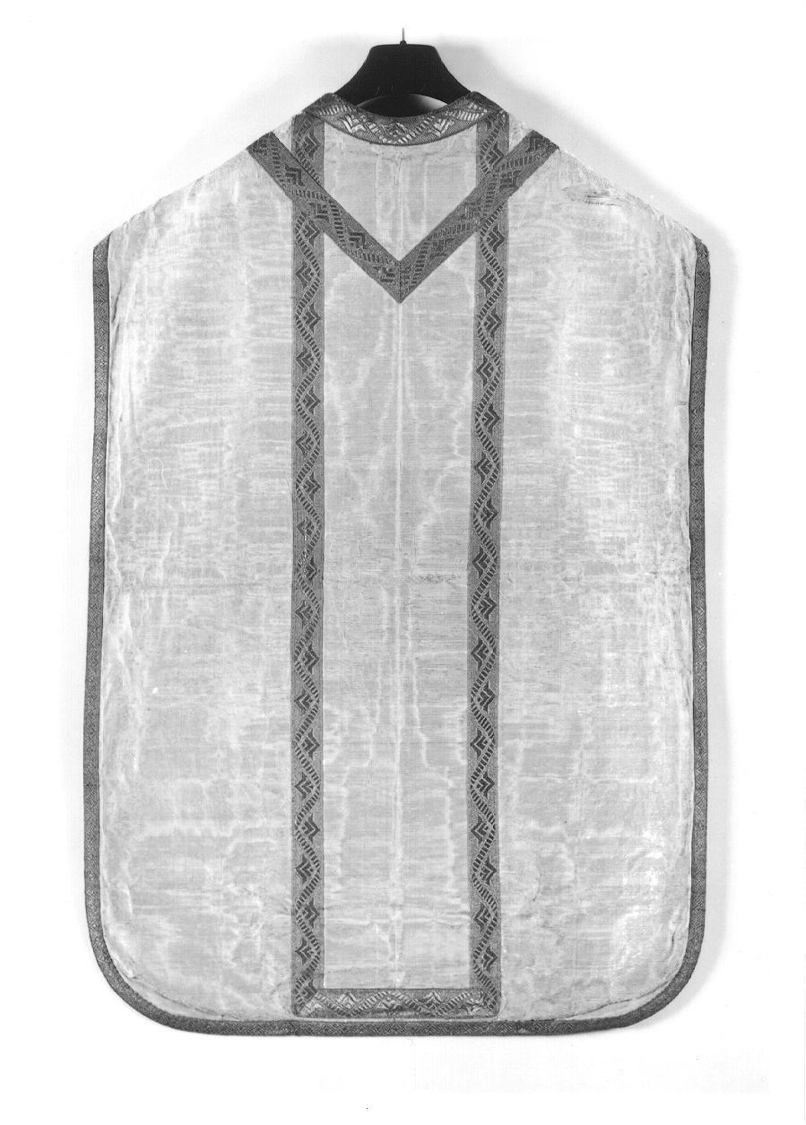 Paramento composto da 4 pianete, 4 stole e un parato per altare. In gros de Tours di seta color avorio laminato con lamina argentata ogni 4 colpi, è rifinito con galloni eseguiti a telaio in filo di seta gialla e filo dorato. Fodera in taffetas di vario colore (originariamente azzurro); interno in tela cerata di colore rosa