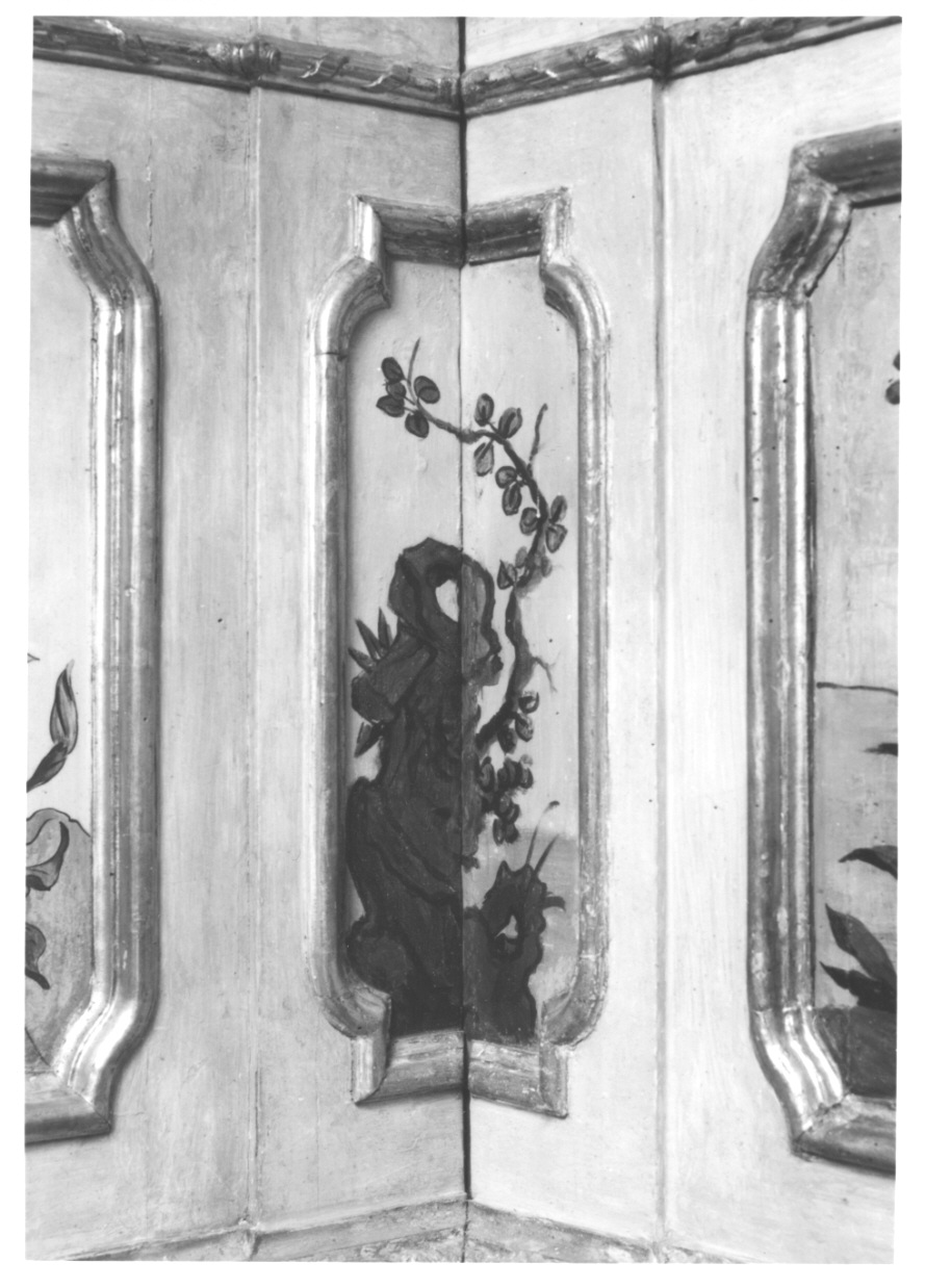 Pannello ligneo di zoccolo dipinto con uccelli, rocce e motivi fitomorfi secondo il gusto orientaleggiante, entro cornice lignea intagliata aggettante dorata