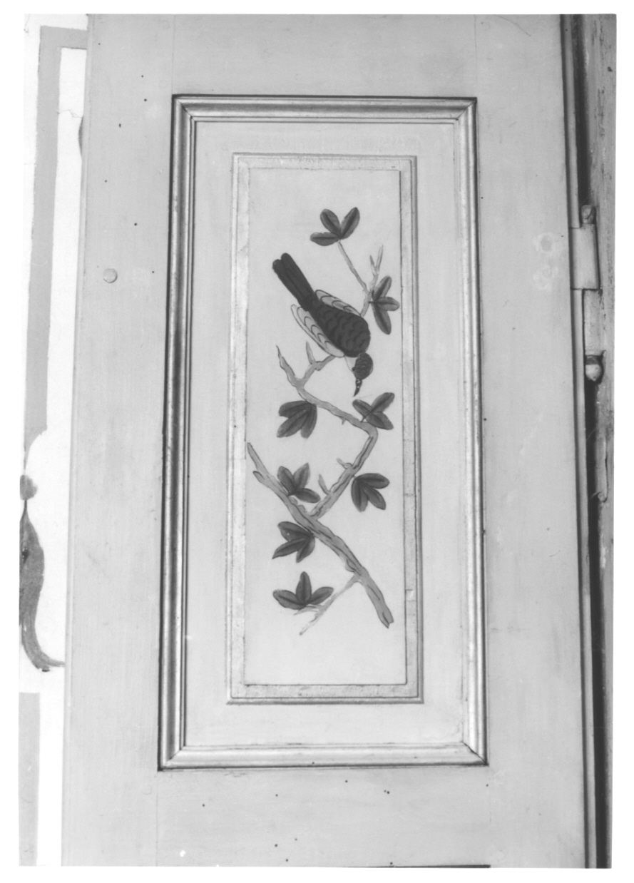 Pannello di scuro di finestra dipinto a motivi decorativi vegetali e uccelli di gusto orientaleggiante