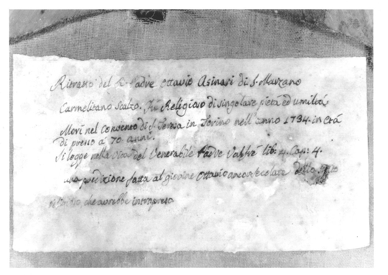- NOTIZIE STORICO CRITICHE Nell'inventario redatto nel 1955 (redatto facendo riferimento alla precedente ricognizione del 1951) la tela è descritta presso i Caseggiati bassi Deposito 27 (p. 838), come ritratto di Ottavio Asinari di San Marzano (padre carmelitano scalzo), opera dii gnoto senza specifiche cronologiche