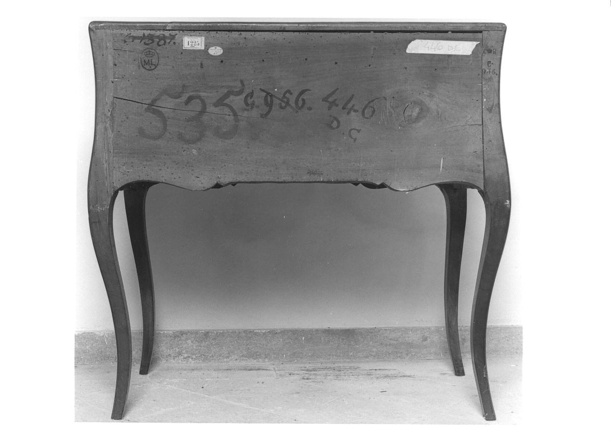 - NOTIZIE STORICO CRITICHE Lo scrittoio, originariamente collocato al primo piano nella camera da letto del Prefetto, potrebbe essere uno dei numerosi mobili trasferiti a più riprese da altre residenze reali, in particolare dal Palazzo Reale di Torino, ad arricchire l'arredo degli appartamenti attigui alla Basilica. Diverse scrivanie del tipo simile a quella analizzata sono documentate da un inventario di mobili acquistati o riadattati per Superga nel 1864. Stilisticamente la scrivania si richiama ad un gusto Luigi XV, secondo una tendenza partita dalla Francia a metà del XIX secolo e presto diffusasi in Europa. Fa parte degli arredi del gruppo "Dotazione Corona". Nell'ultimo inventario, redatto nel 1965, pur non essendoci riscontro numerico, potrebbe coincidere con lo scrittoio nella sala da ricevimento del Prefetto al piano terreno