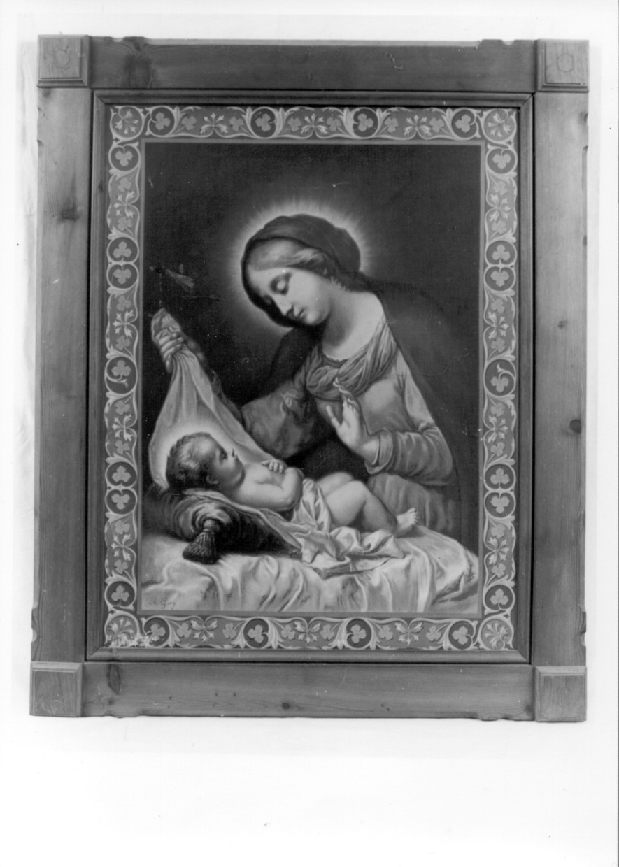 - NOTIZIE STORICO CRITICHE Il dipinto, circondato da una cornice decorata con cartelle ed elementi vegetali, è inserita entro un supporto ligneo. Firmato da A. Gay, artefice non noto, riproduce un dipinto di Guido Reni realizzato anche in incisione