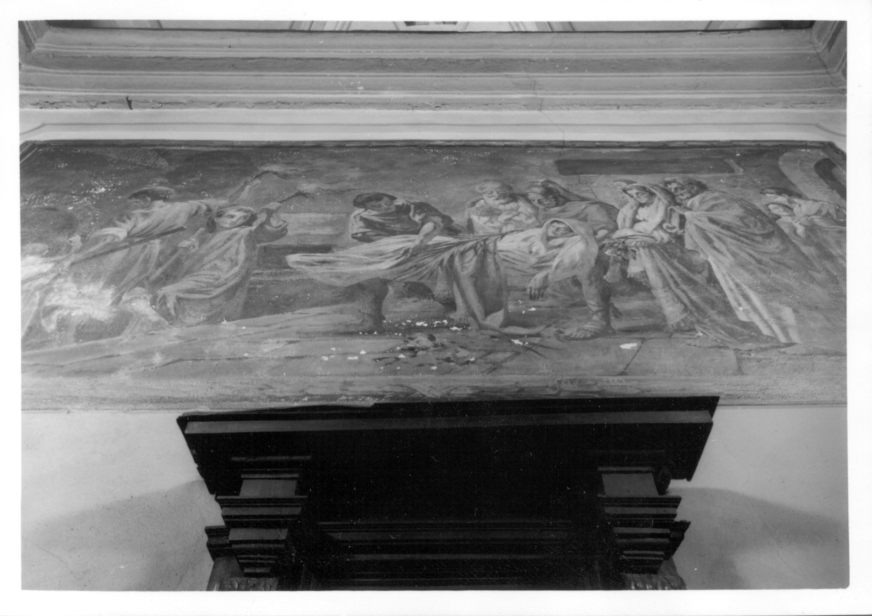 Entro cornice dipinta a ghirlanda. La composizione si snoda a corteo da destra verso sinistra, dove alcune figure in vesti verdi, rosse e gialle, portano fiaccole e scendono verso i gradini della tomba. A destra il gruppo dei fedel dolentii, donne, uomini, un soldato, abbigliati all'antica, che trasportano il corpo del santo, avvolto in un sudario bianco su cui appoggiano il mantello rosso e la palma verde del martirio