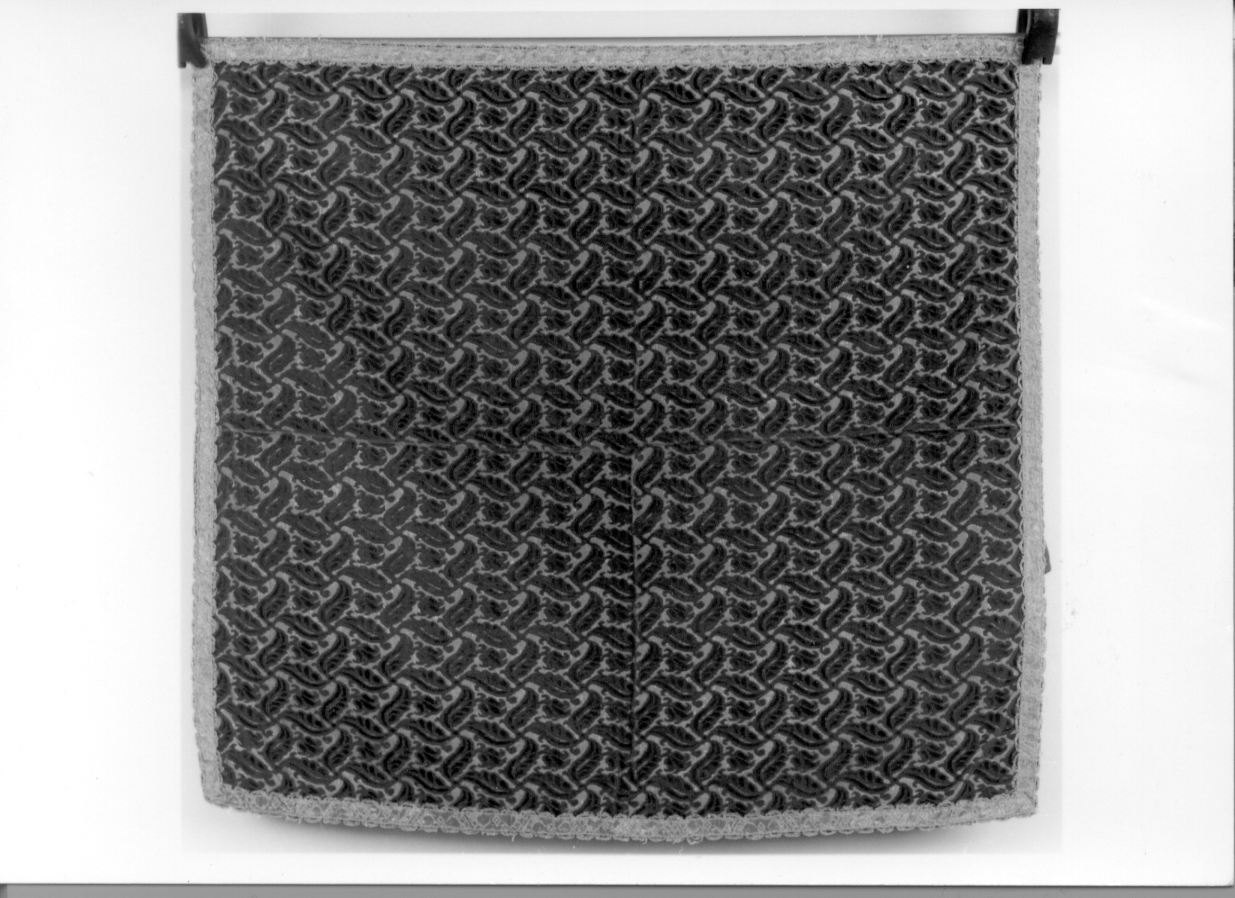 I due manufatti sono realizzato con un pannello di tessuto e sono foderato con del saio di cotone bordeaux in tre pezzi: uno impiegato per il tessuto e gli altri due utilizzati per creale le tasche. E' bordato con un gallone in filo dorato realizzato a telaio, decorato con elementi floreali