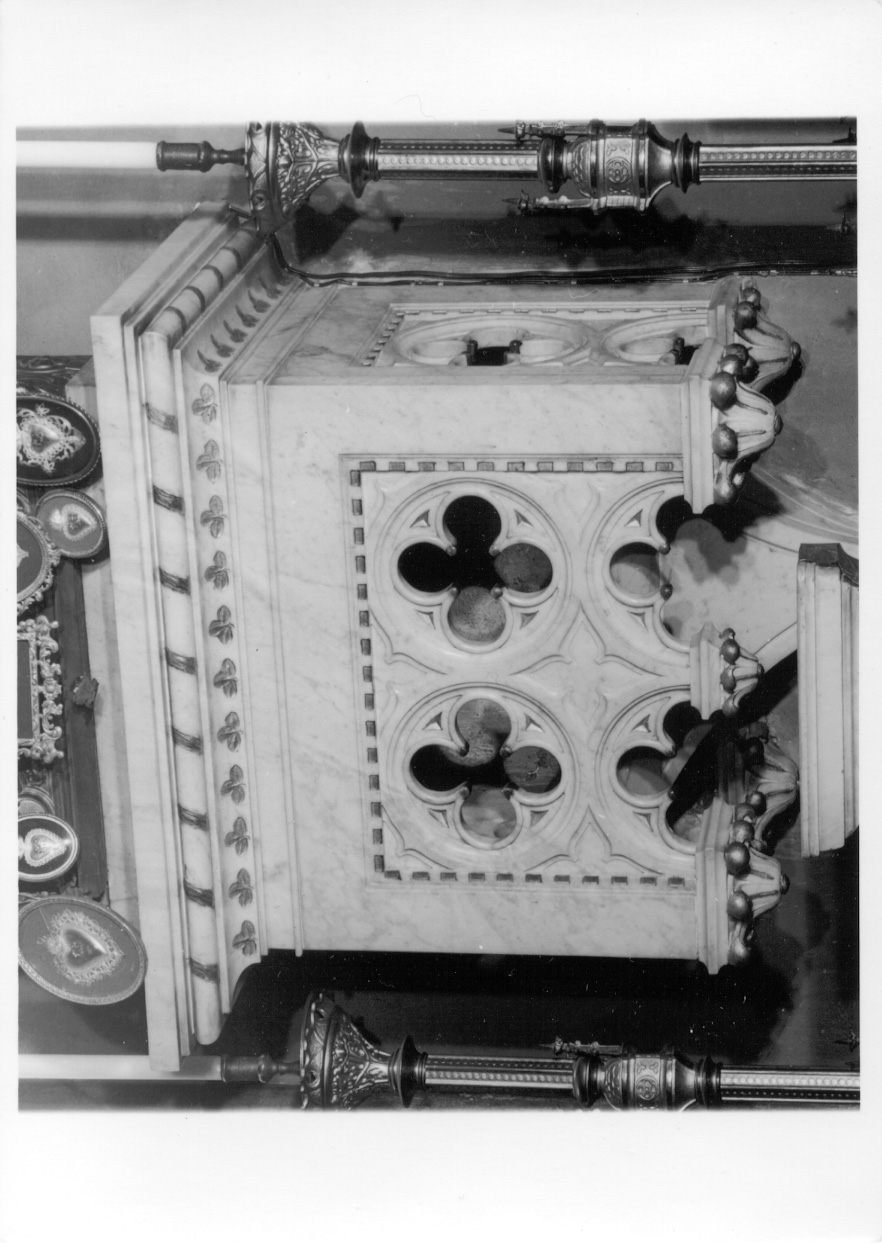 Mensola con base decorata con motivi a traforo a forma quadrilobata e ad archetti pensili. Le terminazioni inferiori sono formate da bulbi di fiori con punte dorate. La cornice superiore aggettante è modanata e ripete un motivo a trifogli dorati e a torciglione
