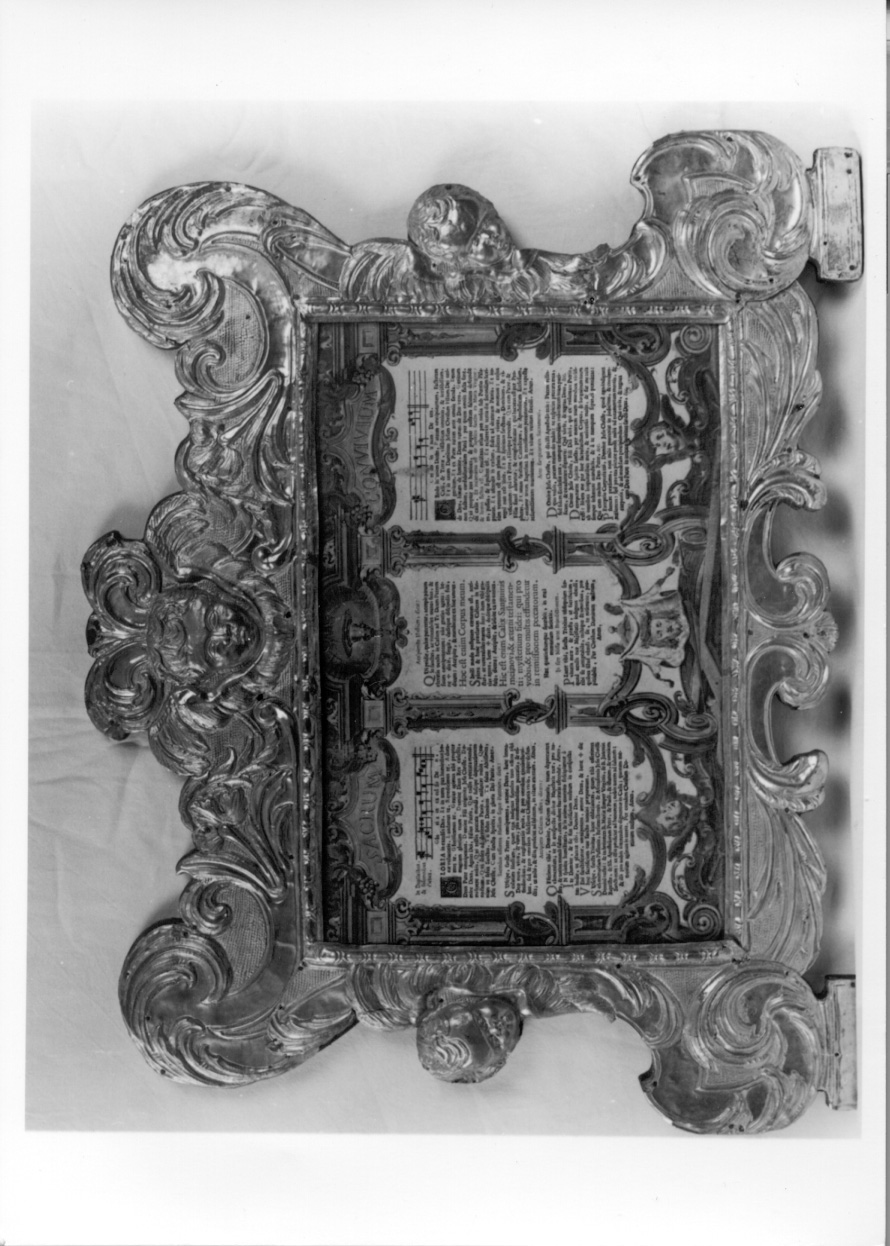 Cornice dal prifilo mistilineo ornata da volute vegetali e teste di cherubino nel centro del lato superiore e dei lati sinistro e destro. La cartella presenta una cornice architettonica dipinta, recante in basso il velo della Veronica e in alto, il calice e dell'ostia. La cartella reca i testi del Gloria e del Credo, con notazioni musicali