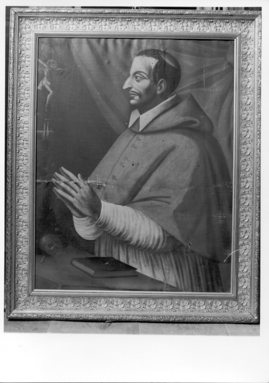 Dipinto ad olio su tela raffigurante San Carlo Borromeo, di profilo, adorante il Cristo crocifisso; alle spalle del santo si intravede una tenda drappeggiata. La cornice in pastiglia dorata non è coeva al dipinto