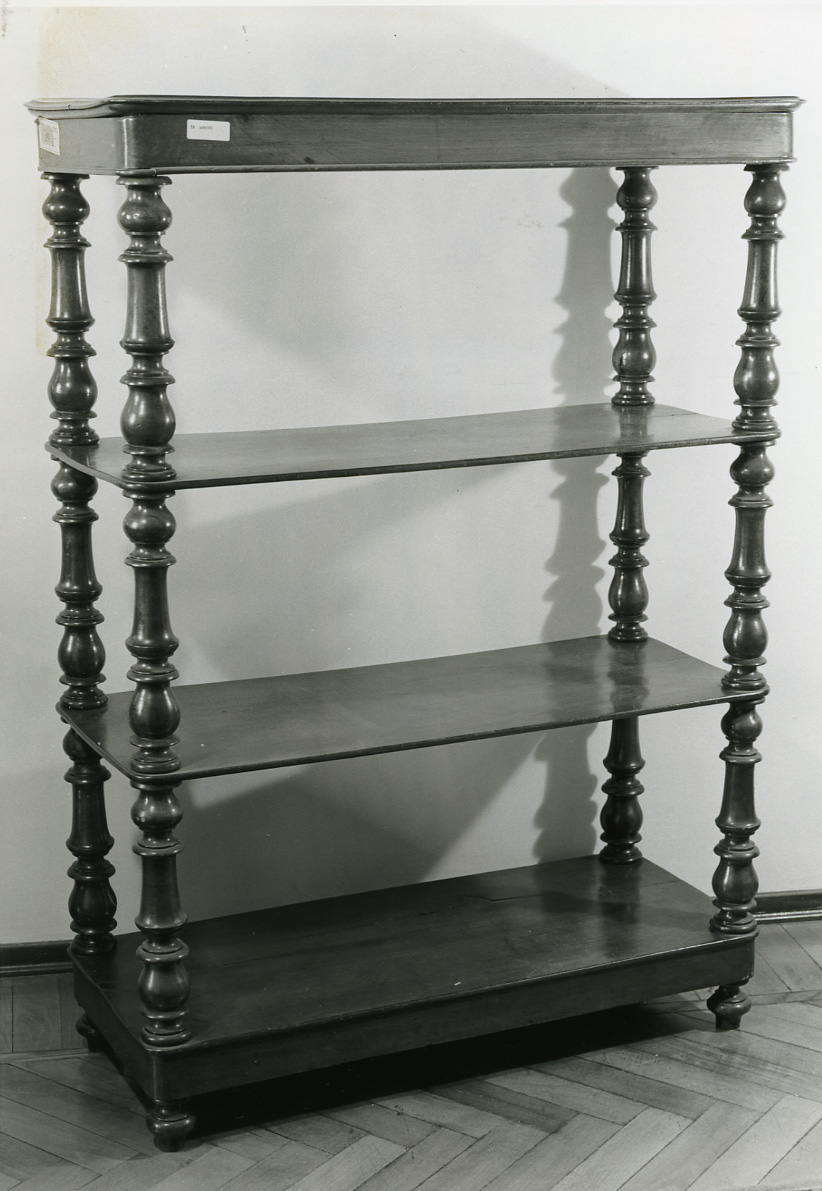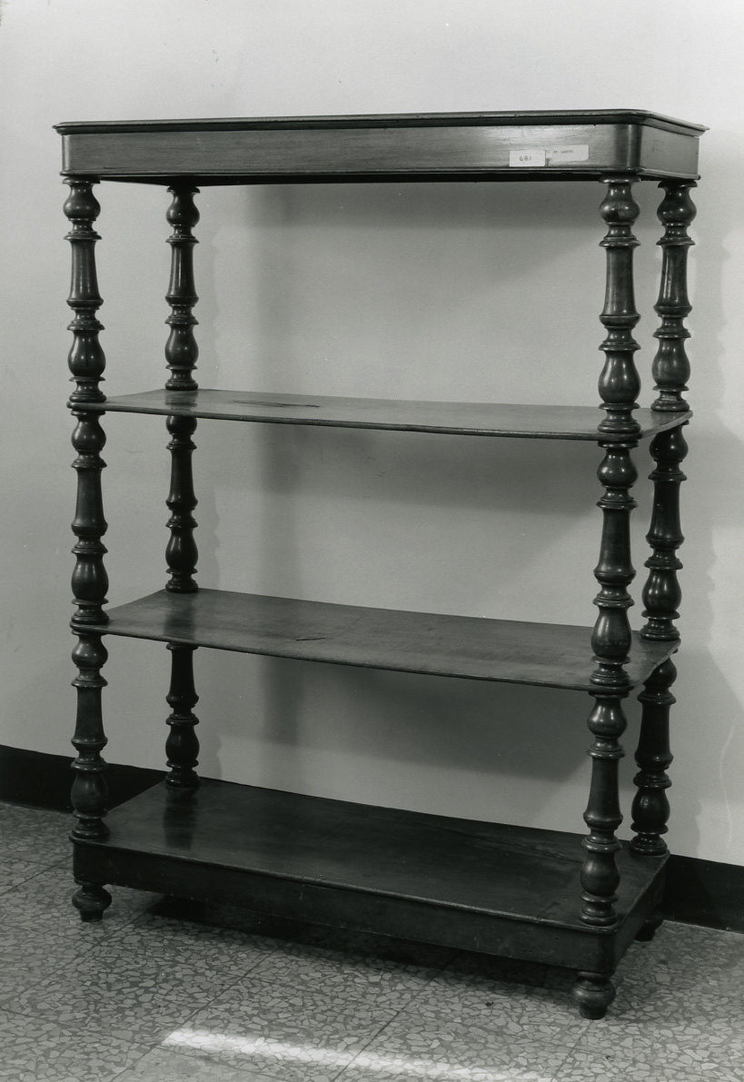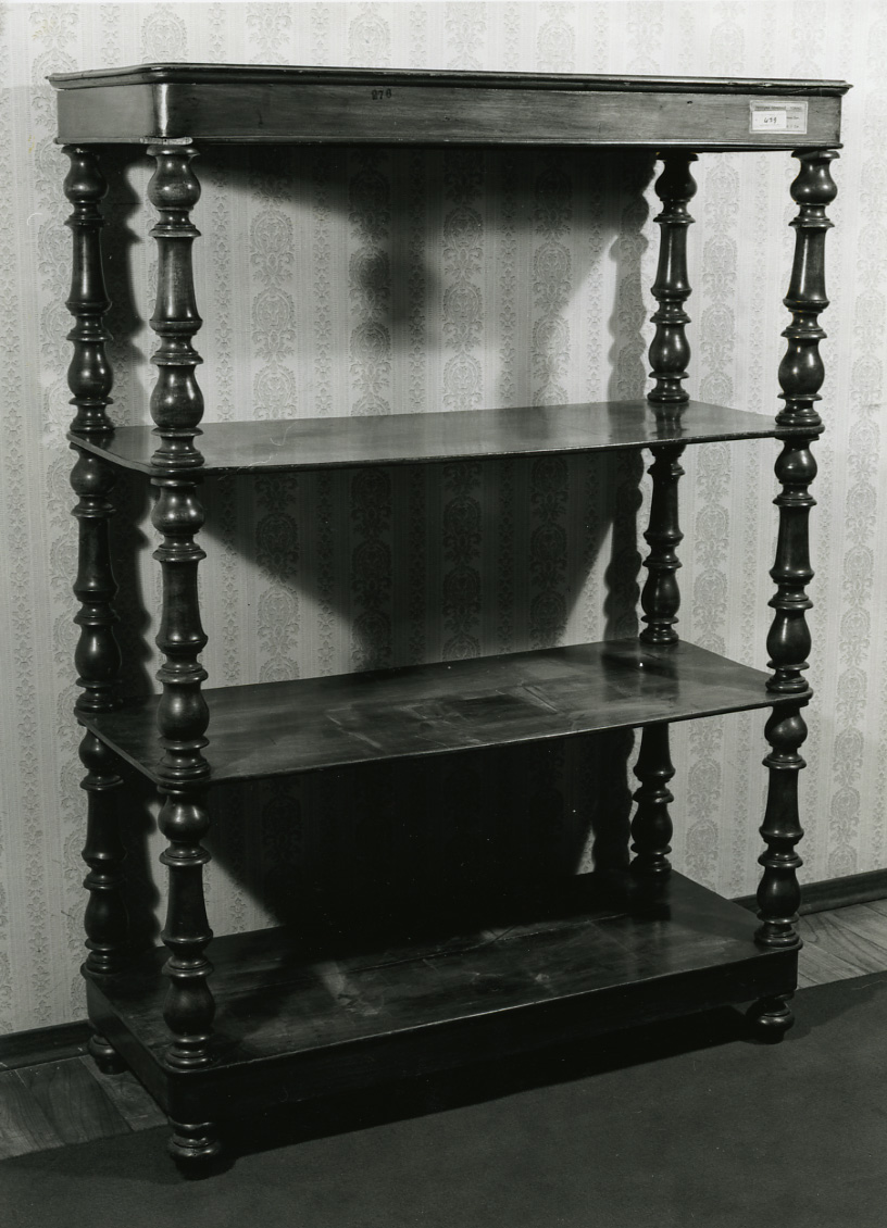Etagere con due ripiani centrali sottili, base e piano alto più spessi. Colonnine tornite