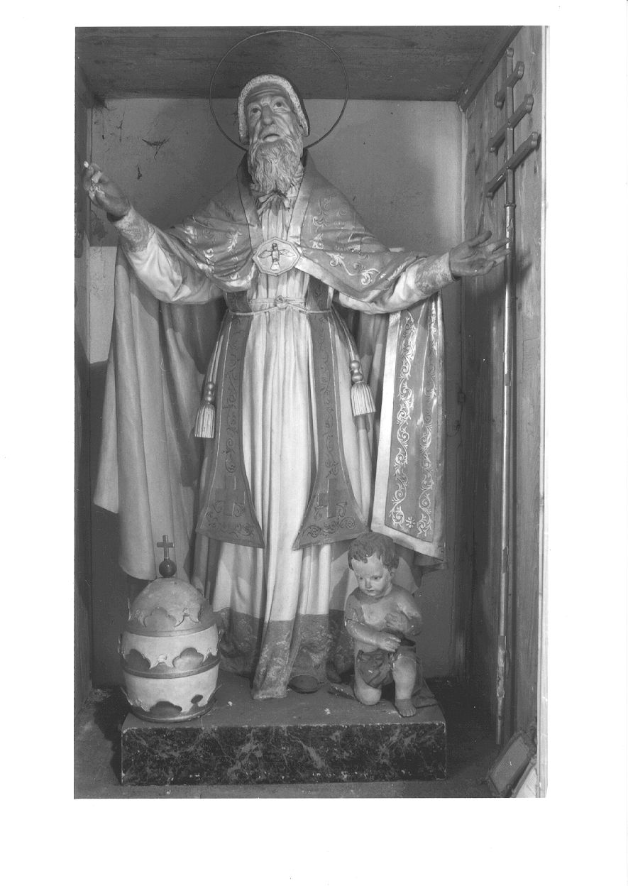 Statua devozionale rappresentante San Pio V con le braccia aperte.; Ai suoi piedi, alla destra una mitra ed a sinistra un angioletto reggicroce.; Tiara giallo carico con decorazioni oro; fodera interna giallo più chiaro.; Tunica bianca con un pizzo di color bordeau applicato sul bordo inferiore ed ai polsi