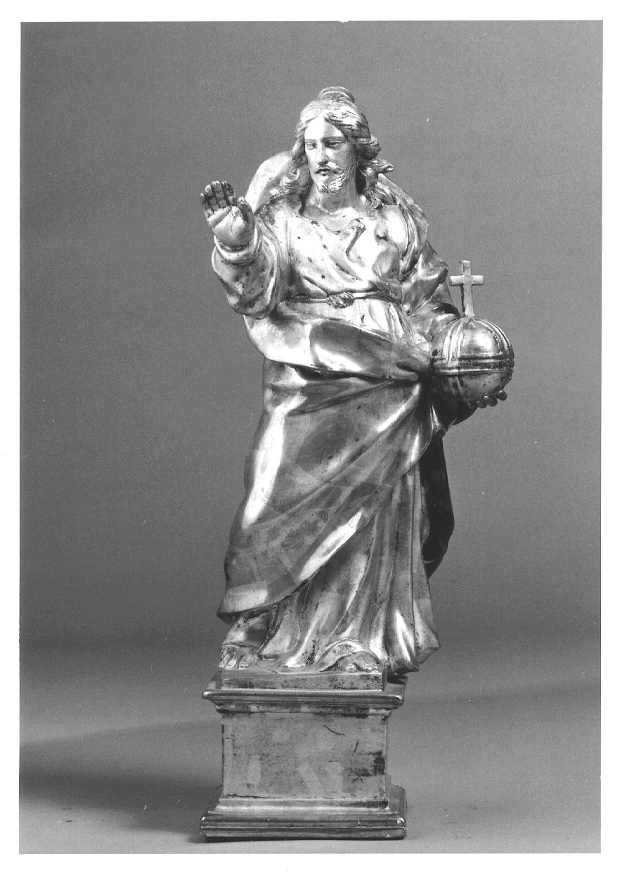 Cristo in atteggiamento regale con il globo nella mano sinistra e avvolto da ampio mantello.; Base cubica