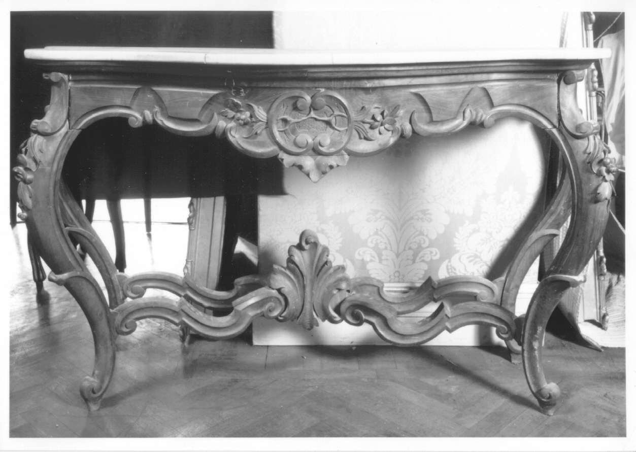 - NOTIZIE STORICO CRITICHE Non si conosce la collocazione originaria della console, già laccata di grigio, come risulta dall'inventario del 1966, che la descrive nella portineria di Palazzo Reale