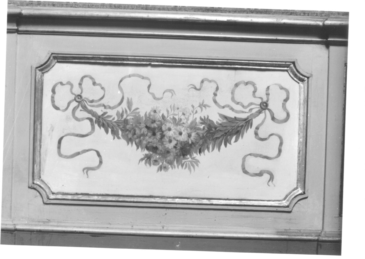 Pannello di lambriggio. Festone di fiori colorati trattenuti da nastri bleu dipinto in riquadro a fondo beige con cornice dorata. Zoccolo color verde chiaro e più scuro