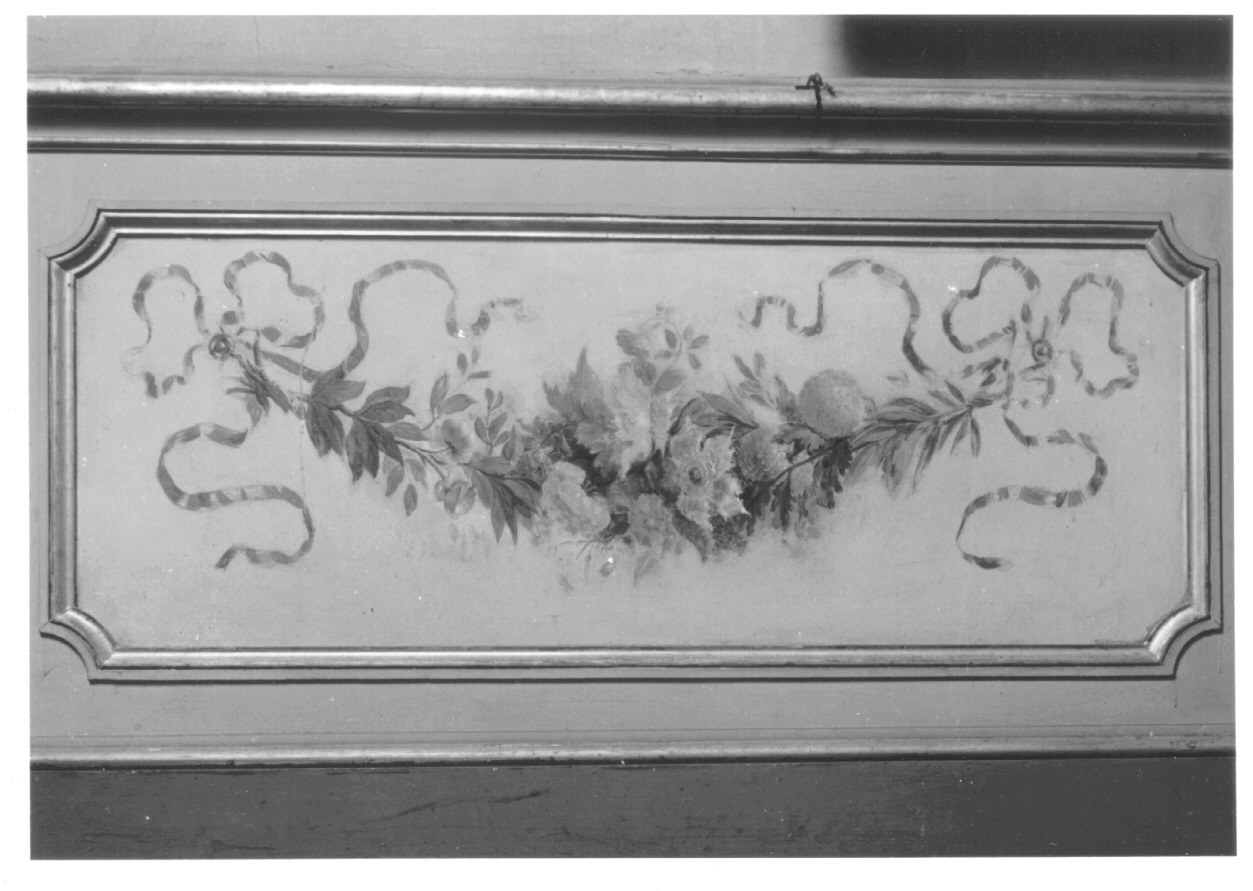 Pannello di lambriggio. Festone di fiori colorati trattenuti da nastri bleu dipinto in riquadro a fondo beige con cornice dorata. Zoccolo color verde chiaro e più scuro