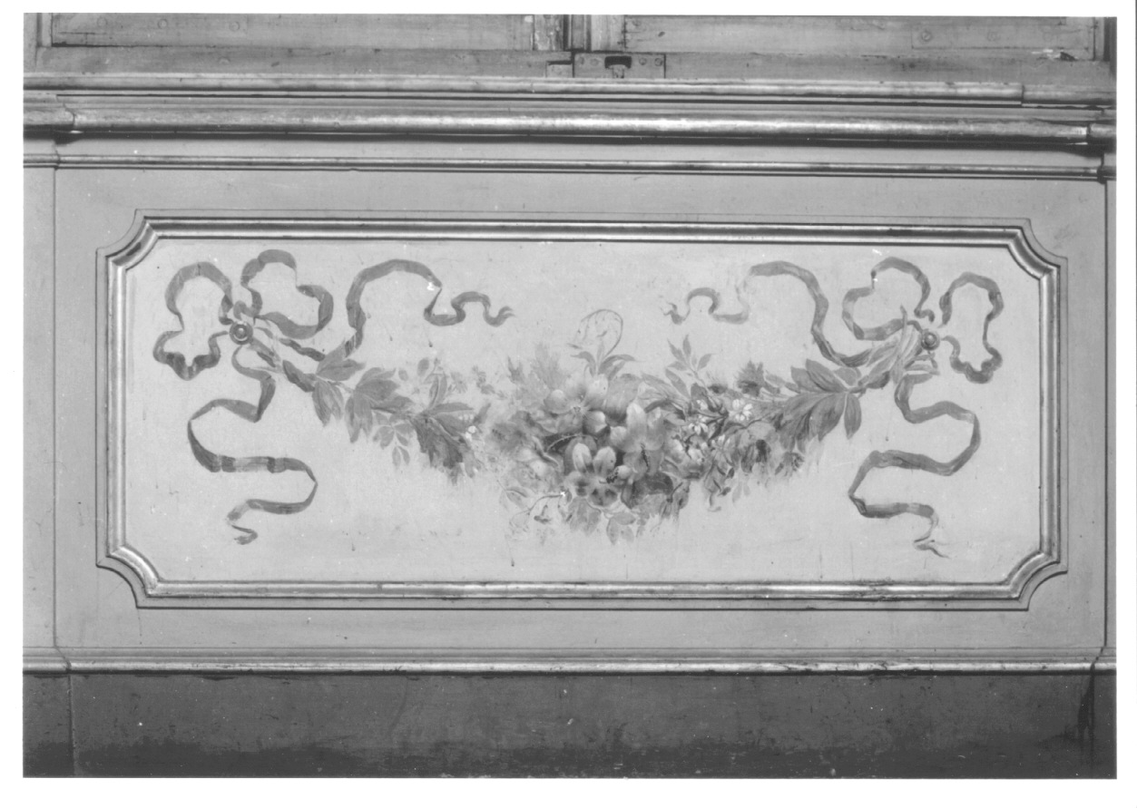 Pannello di lambriggio. Festone di fiori colorati trattenuti da nastri bleu dipinto in riquadro a fondo beige con cornice dorata. Zoccolo color verde chiaro e più scuro