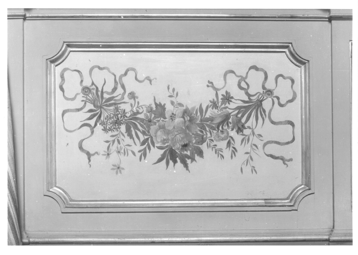 Pannello di lambriggio. Festone di fiori colorati trattenuti da nastri bleu dipinto in riquadro a fondo beige con cornice dorata. Zoccolo color verde chiaro e più scuro