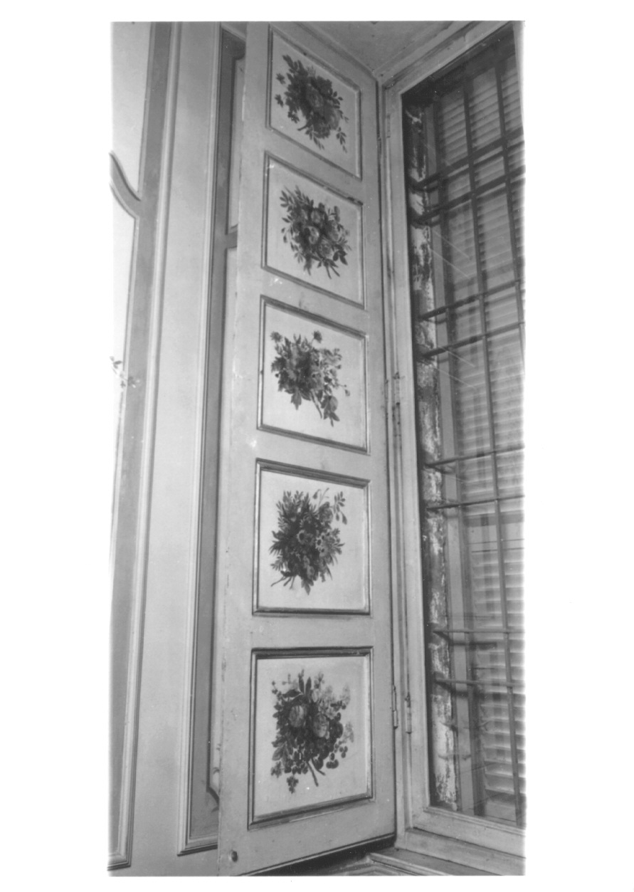 - NOTIZIE STORICO CRITICHE I battenti delle due finestre della stanza presentano una decorazione analoga a quella del lambriggio e delle porte. In mancanza di dati documentari, un valido confronto stilistico è offerto dal lambriggio della Sala degli Staffieri al primo piano del Palazzo, dipinto da Felice Vacca (1780-1856), figlio di Angelo, nel 1841: lo stesso pittore è anche documentato, sempre in occasione dei riallestimenti per il matrimonio del Duca di Savoia (1842), nell' Appartamentino al piano terreno, ancora per "Bocchetti" di fiori. Va comunque considerato che nell'ultimo decennio del secolo, quando l'appartamento risulta abitato (dal 1890) da Maria Letizia Napoleone, duchessa vedova d'Aosta, questa sala in particolare subì una trasformazione radicale