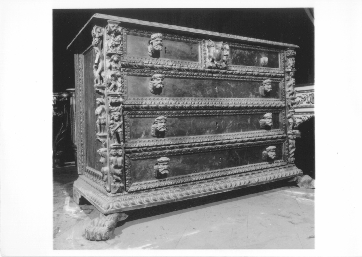 >, n. 1, anno I, giugno 1970, p. 97). L'oggetto presenta sul fronte piedi leonini, sulle lesene, lungo i fianchi, cariatidi e figure simboliche e mitologiche; sulle impugnature dei cassetti teste barbute coronate; tra i due cassetti in alto un riquadro con putti che reggono uno scudo. Attestato a Moncalieri nella Galleria n° 70 della pianta come uno di "Sei cassettoni di legno noce antichi con cinque cassetti a serratura, item ma al centro dei due superiori, montanti e poncelli a frutti, piano con fascia a mandorle, 4 piedi a zampe", ai numeri di inventario 3918-3923 (ASTO, Casa di S.M. , 4684, Inventario mobili di Dotazione della Corona, R. Castello di Moncalieri, 1879, f. 199 verso) - TIPOLOGIA SCHEDA Opere/oggetti d'arte