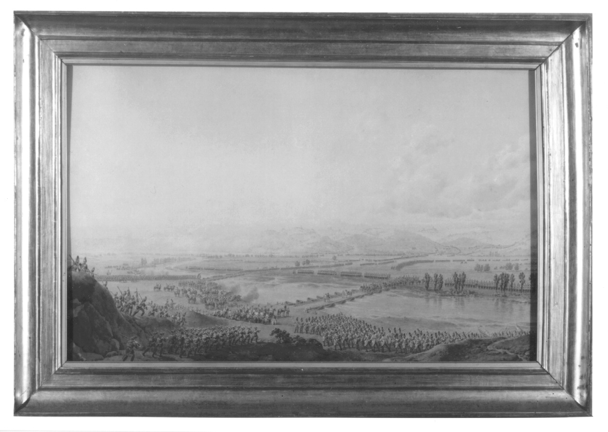 - NOTIZIE STORICO CRITICHE Come la critica ha accertato, la serie delle Battaglie è stata eseguita, in più riprese, da Giuseppe Pietro Bagetti tra il 1818 e il 1831 su commissione di Vittorio Emanuele I: 18 tempere sono documentate nel 1822 nella Galleria delle Battaglie del Palazzo Reale, insieme con le tele delle vittorie del principe Eugenio e di Carlo Emanuele III; nel 1830, l'intero corpus dei 64 pezzi bagettiani, inclusi quindi i Paesaggi d'invenzione, risulta riunito nella Galleria grande del Castello (A. Vesme, vol. I, p. 78). L'Incontro del Principe Eugenio e di Vittorio Amedeo II segue le vicende del nucleo delle battaglie; nel 1881 è conservata nell'Appartamento di Madama Felicita, al piano terreno (stanza n. 37), nel 1911 è trasferita nel corridoio delle Foresterie al terzo piano, nel 1966 infine è inventariata al primo piano, nell'Anticamera della Cappella Regia