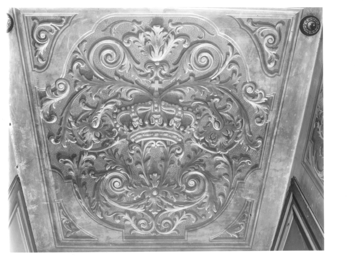- NOTIZIE STORICO CRITICHE Il soffitto dell'ambiente è costituito da un plafone, decorato da motivi vegetali stilizzati a monocromo ocra, che connette un eterogeneo insieme di otto tele racchiuse entro cornici ovali e mistilinee, disposte, per quanto possibile, in modo simmetrico. A questa campagna decorativa appartiene anche la pittura murale dello sfondato della finestra che riprende gli stessi motivi del soffitto, aggiungendo, sullo sguancio in alto, la corona regia. La data di quest'intervento è, per il momento, imprecisabile: un possibile terminus ante quem è la citazione degli "huit tableaux" ricordati nel soffitto di questa stanza dall'inventario del 1807, ma l'aspetto piuttosto pesante degli ornati rocaille dipinti sembra suggerire che la parte pittorica sia stata ampiamente ripresa negli ultimi decenni del XIX secolo