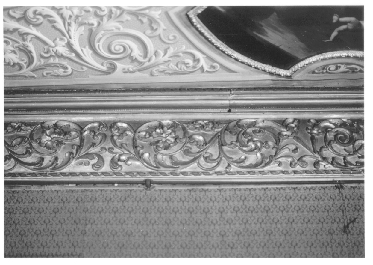 Soffitto dipinto a racemi che circondano campiture ovali e mistilnee in cui sono inserite pitture a olio su tela