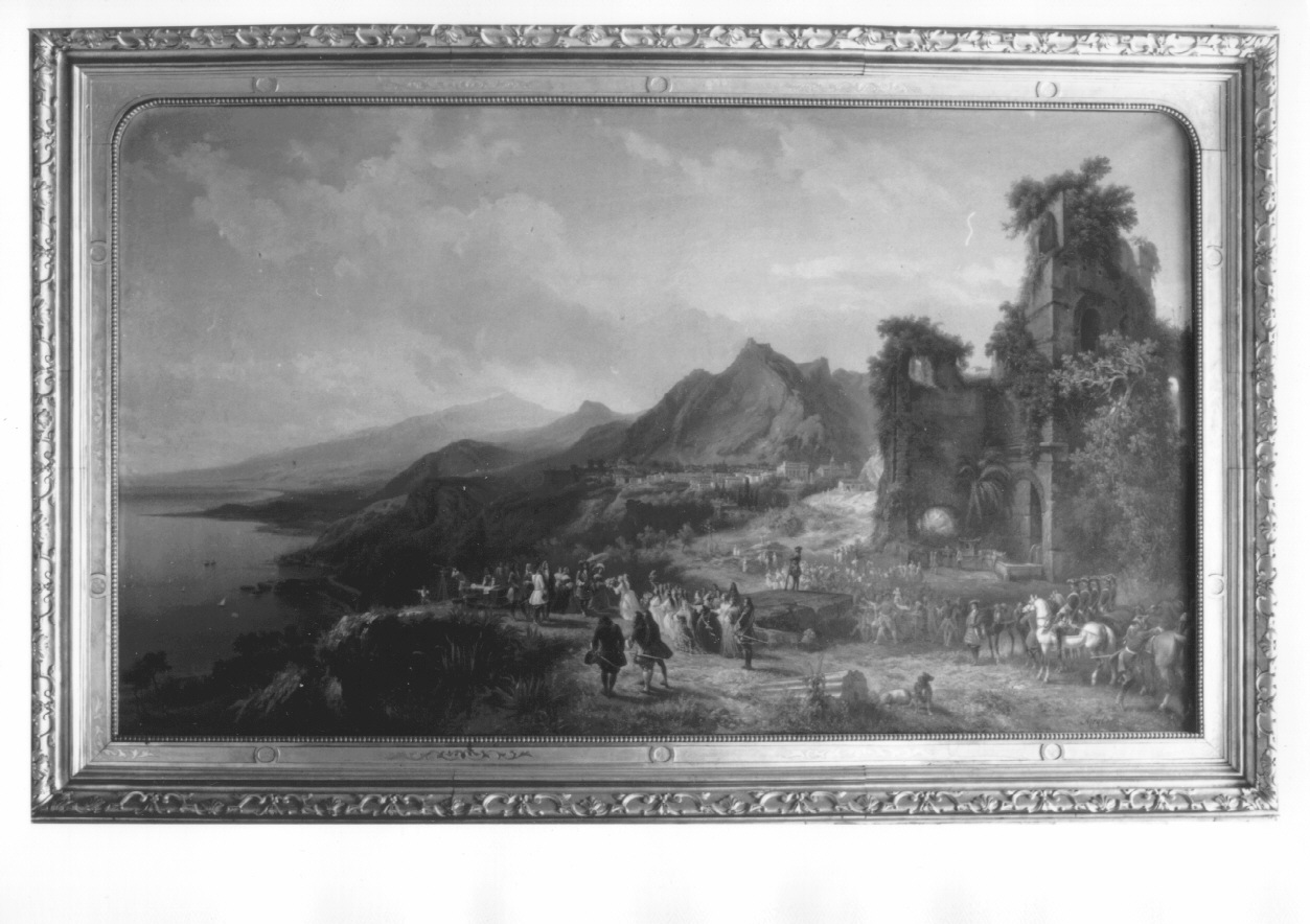 - NOTIZIE STORICO CRITICHE Il dipinto propone l'incontro fra la pittura di paesaggio e i soggetti ispirati ad episodi storici, tappa d'esordio nella carriera artistica di D'Azeglio. E' spiccato nell'opera il legame col contemporaneo ambiente artistico romano neoclassico, in particolare nell'indagine minuziosa degli elementi vegetali e nella nitidissima scansione dei piani, che graduano la profondità della scena. Nello scorcio sulla valle si realizza un esempio di veduta dall'alto, di gusto topografico, in cui non manca una grande attenzione alla definizione del cielo e delle variazioni di luce e ombra portate dalle nubi. Oltre ai contatti che D'Azeglio ha nel corso del terzo decennio a Roma, dove inizia i suoi studi di pittura, non bisogna dimenticare i nomi dei piemontesi Bagetti e De Gubernatis, le cui opere dovevano essere già note all'artista, costituendone il sostrato culturale della sua attività pittorica. L'opera, trascurata dagli studi svolti sull'artista, potrebbe essere meglio definita col riconoscimento del soggetto, che ne lascia supporre la destinazione regia: la scena sembra infatti raffigurare un incontro fra sovrani accompagnati dal loro seguito