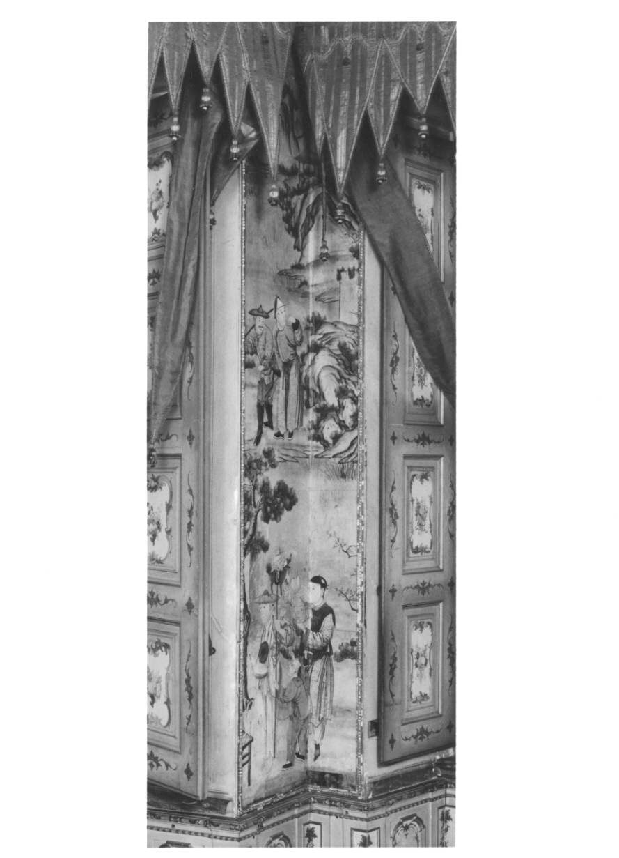 La tappezzeria di questa stanza pare composta di due distinte serie di carte cinesi, i cui pannelli sono stati montati in alternanza