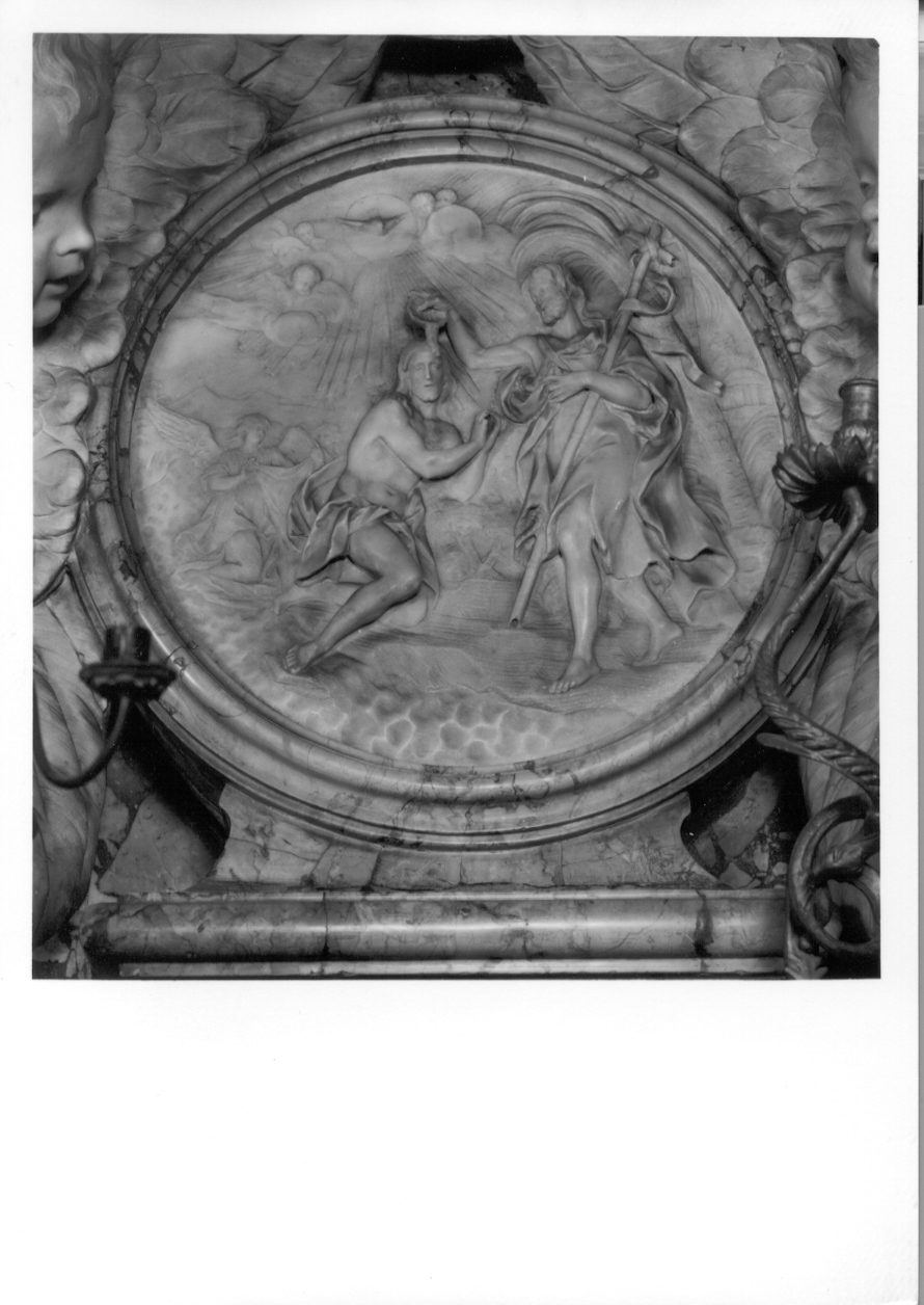 Rilievo in marmo bianco, di forma rotonda, all'interno del quale è scolpito l'episodio biblico del Battesimo di Cristo. La scena è dominata dalle due figure di Cristo, che, avvolto in un mantello, a mani giunte, si rivolge verso lo spettatore, e da Giovanni Battista, che con la mano destra versa l'acqua della conchiglia sul capo del catecumeno. Giovanni è avvolto in una veste e in un mantello dai molti panneggi, e con il braccio sinistro stringe al petto la croce, suo attributo. La scena si svolge in un fiume, di cui sono leggibili, sotto i piedi dei protagonisti, i tratteggi che simulano la corrente. Sulla sinistra di Cristo, un angelo regge un drappo di stoffa con cui il battezzato si potrà asciugare. Nel cielo, illuminato da un grande sole raggiato, che sbuca dalle nuvole, ci sono quattro cherubini che assistono alla scena. La composizione è chiusa, sulla sinistra, da una palma, dietro cui si intravede la struttura a pianta centrale di un tempio