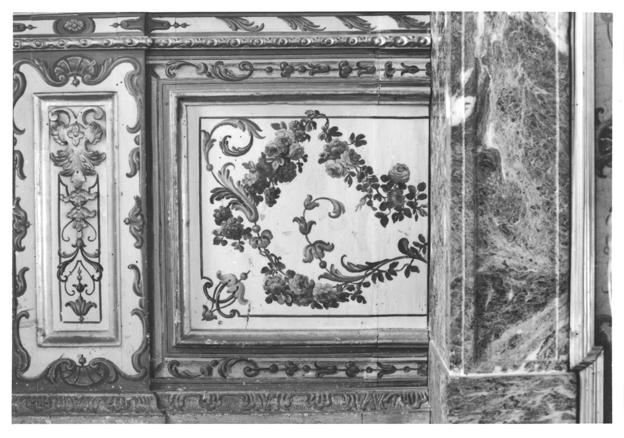 Zoccolo intagliato, dipinto e dorato; pannelli recanti putti alati e ghirlande di fiori