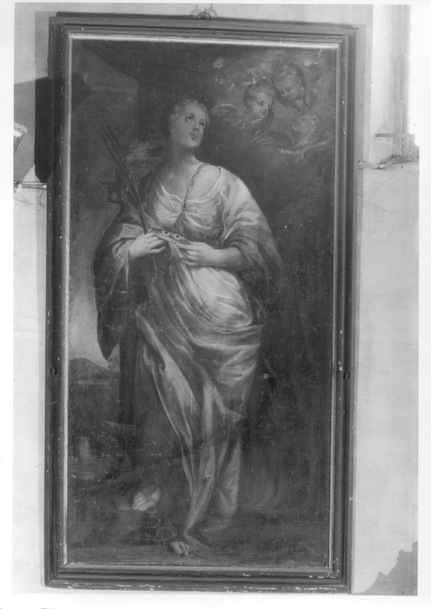 - NOTIZIE STORICO CRITICHE Il dipinto è presumibilmente identificabile con quello segnalato su uno dei pilastri laterali della chiesa nel 1725, insieme ad un'altra tela perduta raffigurante San Francesco da Paola. Non conosciamo il nome dell'artefice, operante, come sembra, nel primo Settecento e presumbilmente di ambito cusiano e a conoscenza della pittura lombarda coeva. Depone in questa direzione la lettura filologica della tela, nella raffigurazione della santa avvolta, nella sua figura allungata e sottile, in una veste animata da pieghe vibranti, il volto estaticamente rivolto verso il cielo, lo sguardo languido. Verrebbe da evocare il nome del più tardo Luca Rossetti, autore della decorazione ad affresco della chiesa, ma il nostro pittore presenta maggiori morbidezze, colori più sfumati e toni più evanescenti, che conducono a tempi antecenti, seppur di poco, rispetto a quelli in cui operava lo stesso Rossetti.L'iconografia del dipinto ricalca quasi testualmente quella utilizzata nel quadro collocato nella quadreria dell'orfanotrofio novarese di Santa Lucia, riferito ad un pittore della cerchia di Stefano Montalto. Le affinità sul piano tipologico fanno pensare ad un modello qui evocato, al di là delle evidenti riprese da esemplari di fine Cinquecento e in particolare dalle sante martiri di roncalliana memoria. D'altra parte la commissione di questo quadro ad Orta era in relazione con la presenza delle reliquie della santa conservate nella chiesa che ne avevano indotto una devozione particolare
