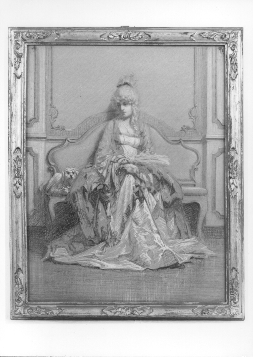 La donna è ritratta a figura intera, seduta su un divanetto, all'interno di un ambiente con decorazione rocaille e volge lo sguardo verso sinistra. Indossa un ricco abito settecentesco sui toni del rosa. Accanto a lei è acucciato un cagnolino bianco. Cornice in legno intagliato e dorato, con motivi fitomorfi lungo gli angoli ed ai centri. Provvisto di vetro
