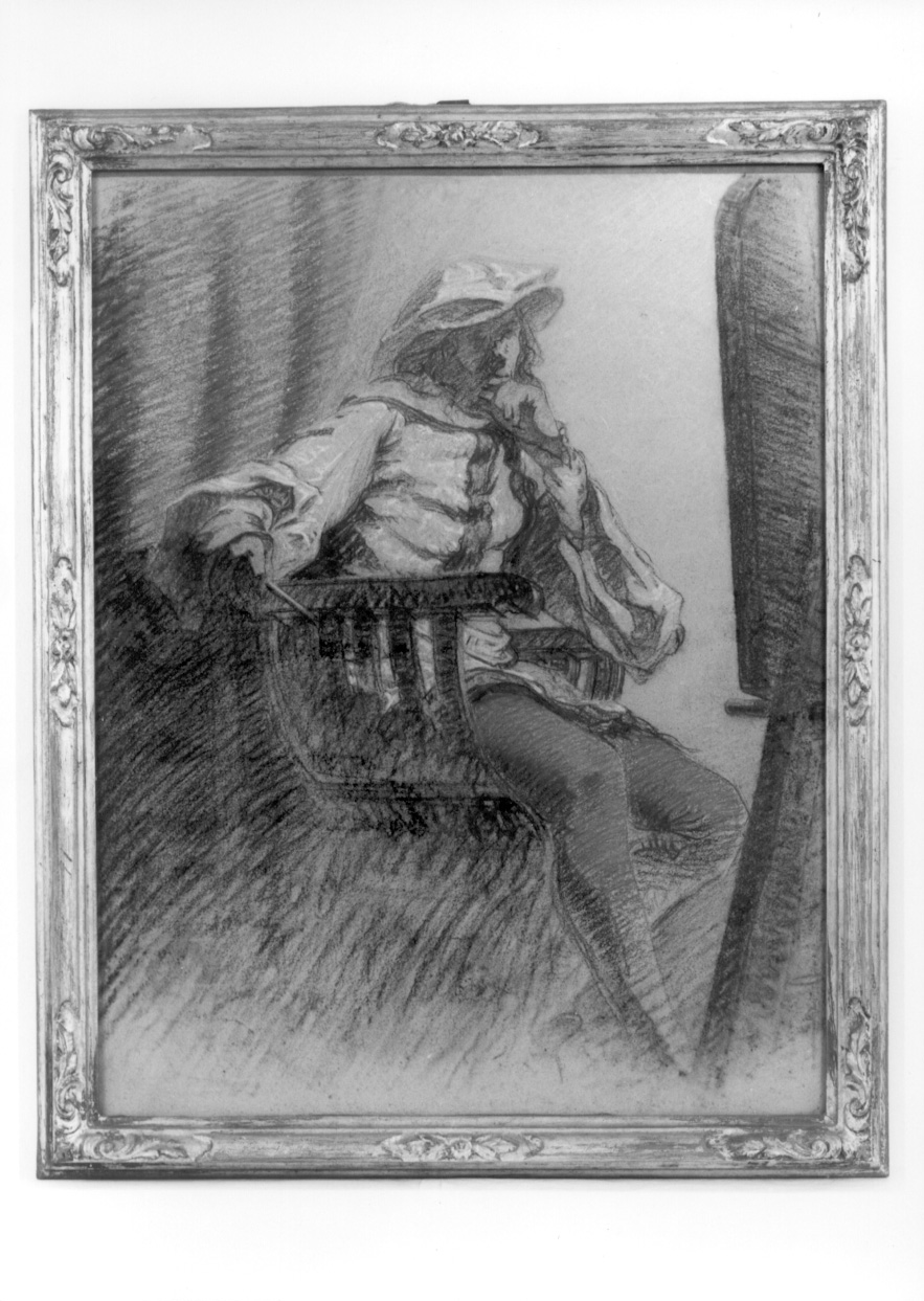 L'uomo è ritratto a figura intera, seduto su un seggiolone pieghevole (del tipo "Savonarola"), con una mano che sostiene il mento con due dita. Il viso è in ombra, delineato con tratti veloci e sommari; sembra guardare verso un cavaletto su cui è appoggiato un quadro centinato, di cui si vede solo il profilo sulla destra della composizione. Indossa abiti medievali: calzamaglia, casacca con larghe maniche, guanti e cappello con tesa larga e morbida. Cornice in legno intagliato e argentato, con motivi fitomorfi lungo gli angoli ed ai centri. Provvisto di vetro