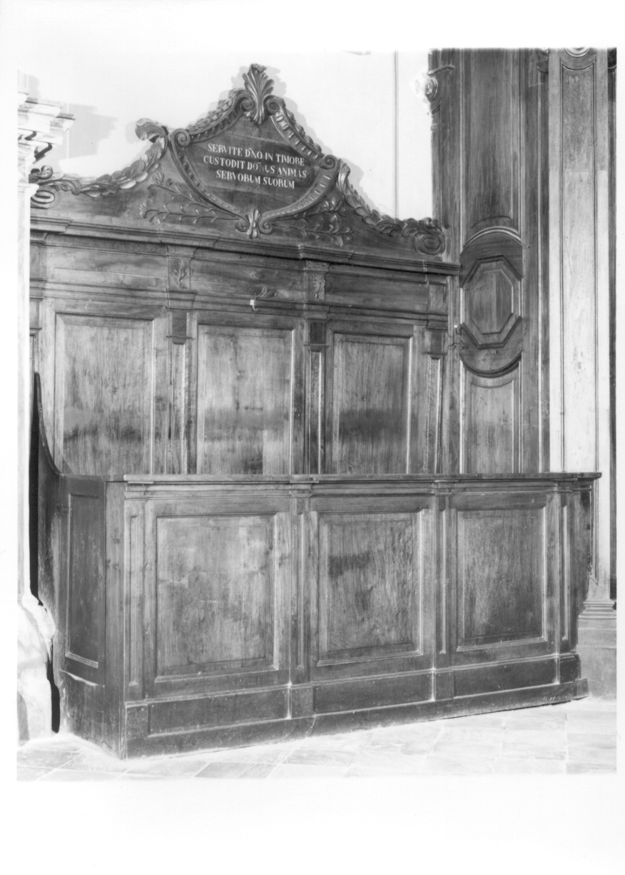 - NOTIZIE STORICO CRITICHE Il banco è il pendant di quello simile che si trova addossato a destra della bussola maggiore, realizzato su commissione di don Domenico Lingua, Vicario parrocchiale tra il 1816 e il 1862, che "nel 1837 (...) fece costrurre a proprie spese un nuovo Battistero tutto in legno noce, presso la porta principale, e dell'antico si ritenne la sola vasca in marmo": Gallo F. Memorie storiche, in Armando L. (a cura di), Da Pieve di Santa Maria a Parrocchia di Maria Assunta a Caraglio, Cuneo 2000, p. 95. Tale banco fu riadattato per accogliere un antico fonte battesimale. Questo potrebbe esserne stato il modello, e potrebbe quindi essere riferito ai primi decenni del XIX secolo