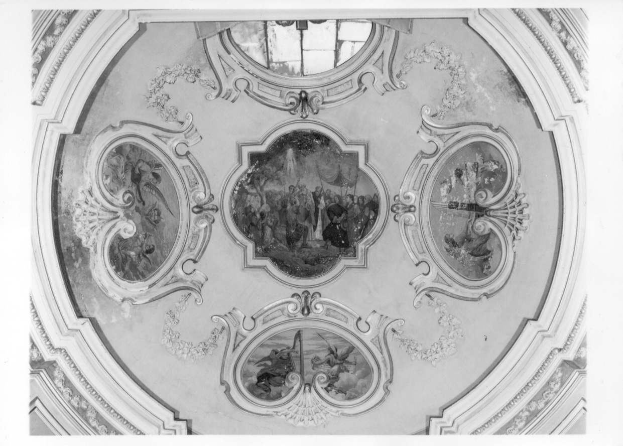 La volta cupolata della cappella è ornata da cinque decorazioni plastiche contenenti dipinti murali e da un lucernario. Al centro della volta è una formella quadrilobata a doppia profilatura modanata e dorata. Essa è attorniata da quattro inquadramenti plastici a profilatura perimetrale mistilinea comprendente timpani curvilinei superiori con volute dorate, tra cui si dispongono tre brevi fogliette dorate, due motivi decorativi laterali sporgenti dai quali si dipartono ghirlande fiorite che uniscono i quattro inquadramenti tra di loro, ed un motivo decorativo a conchiglia posto nella parte inferiore di ciascuno dei quattro riquadri. La cornice perimetrale interna dei riquadramenti termina inferiormente in una coppia di volute contrapposte