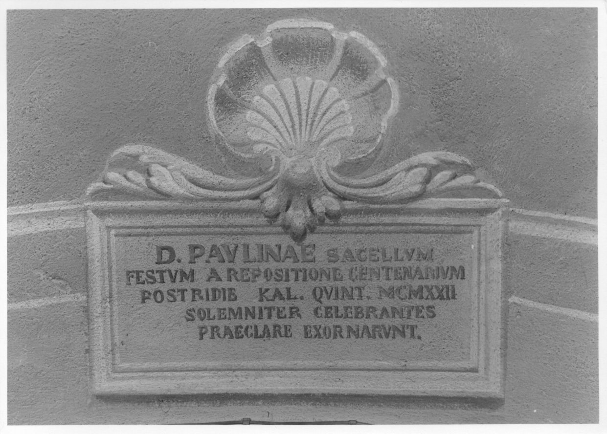 - ISCRIZIONI su tabella dipinta - D. PAULINAE SACELLUM / FESTUM A REPOSITIONE CENTENARIUM / POSTRIDIE KAL. QUINT. MCMXXII / SOLEMNITER CELEBRANTES / PRAECLARE EXORNARUNT - lettere capitali - a pennello - latino